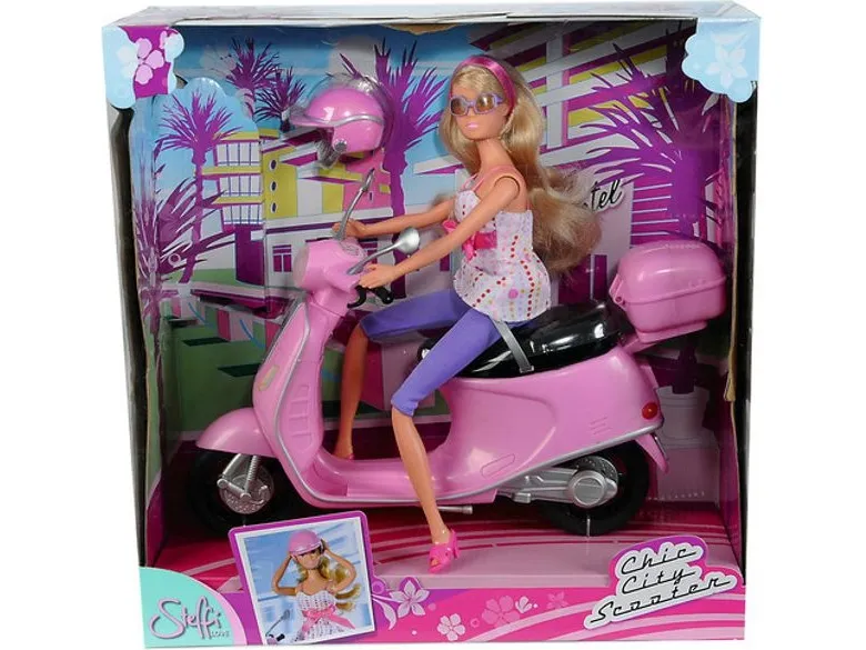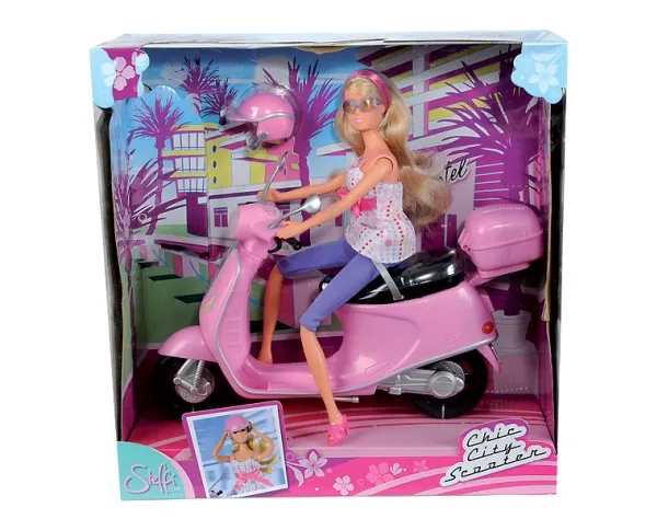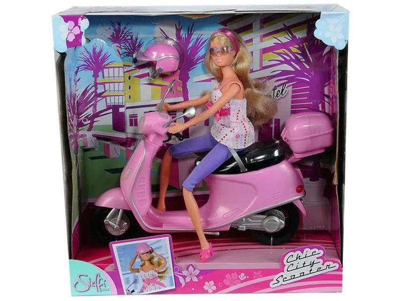 Steffi and her stylish City Scooter are perfect for exciting trips round and about town. To keep Steffi safe, she has a helmet which she can store in the special helmet compartment on the scooter.