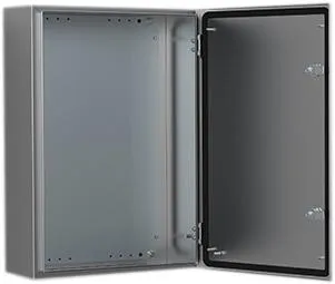 Material: AISI 304L / AISI 316L rustfrit stål med slebet overfladefinish. Kabinet: 1.5 mm. Dør til AISI 304L: 1.5 mm / 2 mm til skabe med en højde eller bredde på 600 mm eller derover. Dør til AISI 316L: 2 mm. Monteringsplade: 2 mm galvaniseret stål. Body: Bukket og fuldsvejst. For at lette monteringen er hvert hjørne på bagsiden af skabet lasermærket for præcist at angive, hvor hullerne skal bores, og hvor der skal monteres AWS- vægmonteringsbeslag. Door: Hjørne formet i et stykke. Overflademonteret med 130° åbning. Skjult AISI 304 rustfrit stål hængsler med låsepind. Kan monteres til at åbne i venstre eller højre side. For AISI 316L sikres forsegling med en opskummet silikonepakning i et stykke. Indvendige M6 svejsede studse til montering af dørprofiler MMDP. Lock: nVent HOFFMAN specialdesign zamak dobbelt-bit 3 mm lås med 90° bevægelse og anti-vibrationsmekanisme. To låse til 600 mm høje og op til 800 mm høje skabe. Espagnolette 3-punkts lås eller 3 låse til 1000 mm høje skabe