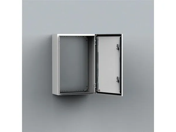 Material: Kabinet: 1,2 mm lakeret stål til skabe med en dybde på 155 mm / 1,4 mm til skabe med en dybde på 210 eller 260 mm / 1,5 mm til skabe med en dybde på 300 eller 400 mm, eller hvis en højde eller bredde er 1000 mm eller større. Flange: 1,4 mm lakeret stål. Dør: 1,2 mm lakeret stål / 1,5 mm for skabe med en højde eller bredde 500 mm eller større / 2 mm til skabe med en højde eller bredde på 800 mm eller derover. Monteringsplade: 2 mm galvaniseret stål. Body: Kantbukket og fuldsvejst. Fire huller 8.5 mm diameter til montering på væg, udpresset i 20.4 mm diameter × 2 mm forsænkninger af hensyn til luftcirkulation bag skabets bagside. Door: Overflademonteret med 130° åbning. Skjulte aftagelige hængsler med låsepind. Hængsler kan monteres til at åbne i venstre eller højre side. Indvendige M6 svejsede studse til montering af dørprofiler MMDP. Sikker tætning med en opskummet polyurethanpakning i et stykke. Lock: nVent HOFFMAN specialdesign dobbelt-bit 3 mm lås med 90° bevægelse o