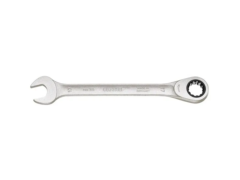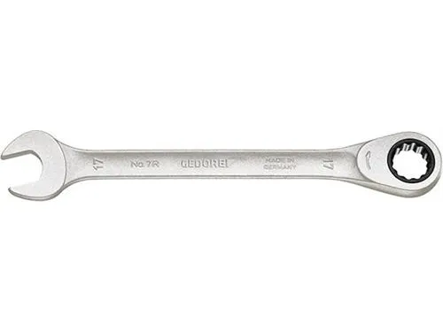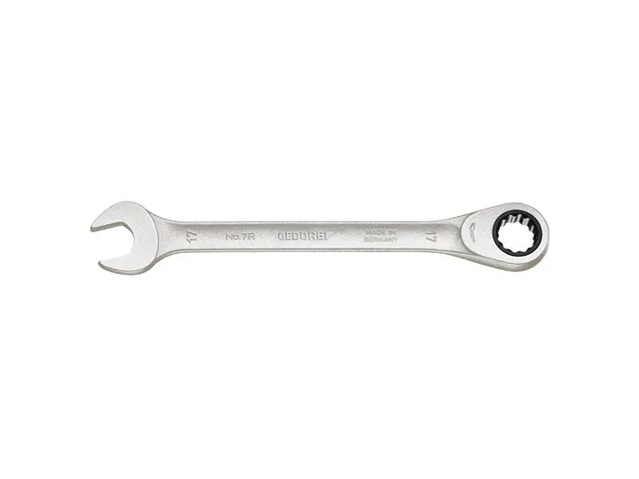 With same size each end. Flat pattern. UD profile. Working angle: 7° from 8 to 15 mm, 6° from 16 to 27 mm and 5° from 30 to 36 mm. For ratchet loosening and fast tightening. High torque transfer. Hollow profile comfortable to hold. Warp-resistant geometry with double T-girder effect. Gedore vanadium steel 31CrV3. Non-glare look thanks to matt chrome-plating, locking insert and pawl manganese-phosphated. Hot forged. Jaw exactly ground to spanner size. Tried-and-tested Gedore technology combined anew: spanner jaws of classic no. 6, stable hollow shaft of no. 7 and refined mechanism of the U-20 ratchets. In combination with adaptor 7 RA or 7 RB (please order separately) the spanner 7 R can be used as a (bit) ratchet. European Patent applied.