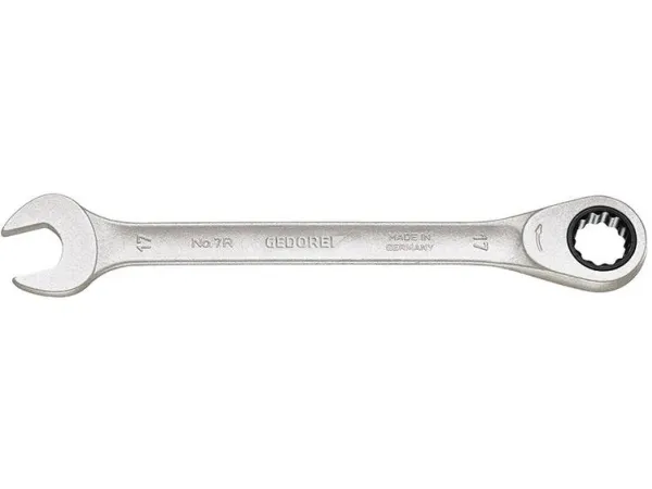 With same size each end. Flat pattern. UD profile. Working angle: 7° from 8 to 15 mm, 6° from 16 to 27 mm and 5° from 30 to 36 mm. For ratchet loosening and fast tightening. High torque transfer. Hollow profile comfortable to hold. Warp-resistant geometry with double T-girder effect. Gedore vanadium steel 31CrV3. Non-glare look thanks to matt chrome-plating, locking insert and pawl manganese-phosphated. Hot forged. Jaw exactly ground to spanner size. Tried-and-tested Gedore technology combined anew: spanner jaws of classic no. 6, stable hollow shaft of no. 7 and refined mechanism of the U-20 ratchets. In combination with adaptor 7 RA or 7 RB (please order separately) the spanner 7 R can be used as a (bit) ratchet. European Patent applied.
