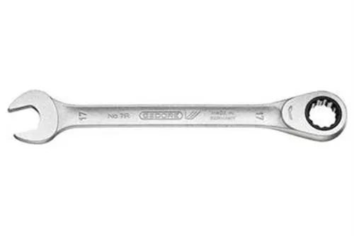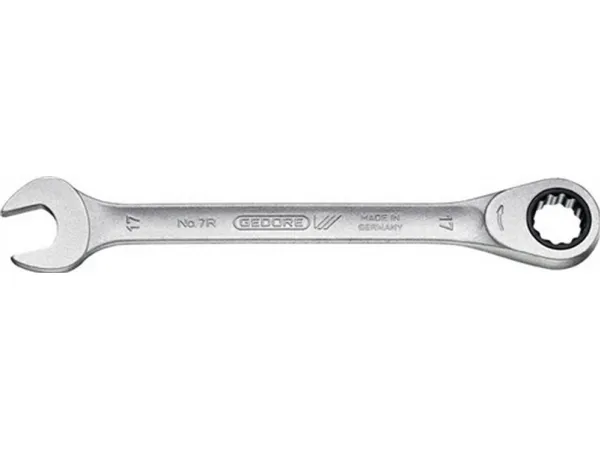 With same size each end. Flat pattern. UD profile. Working angle: 7° from 8 to 15 mm, 6° from 16 to 27 mm and 5° from 30 to 36 mm. For ratchet loosening and fast tightening. High torque transfer. Hollow profile comfortable to hold. Warp-resistant geometry with double T-girder effect. Gedore vanadium steel 31CrV3. Non-glare look thanks to matt chrome-plating, locking insert and pawl manganese-phosphated. Hot forged. Jaw exactly ground to spanner size. Tried-and-tested Gedore technology combined anew: spanner jaws of classic no. 6, stable hollow shaft of no. 7 and refined mechanism of the U-20 ratchets. In combination with adaptor 7 RA or 7 RB (please order separately) the spanner 7 R can be used as a (bit) ratchet. European Patent applied.