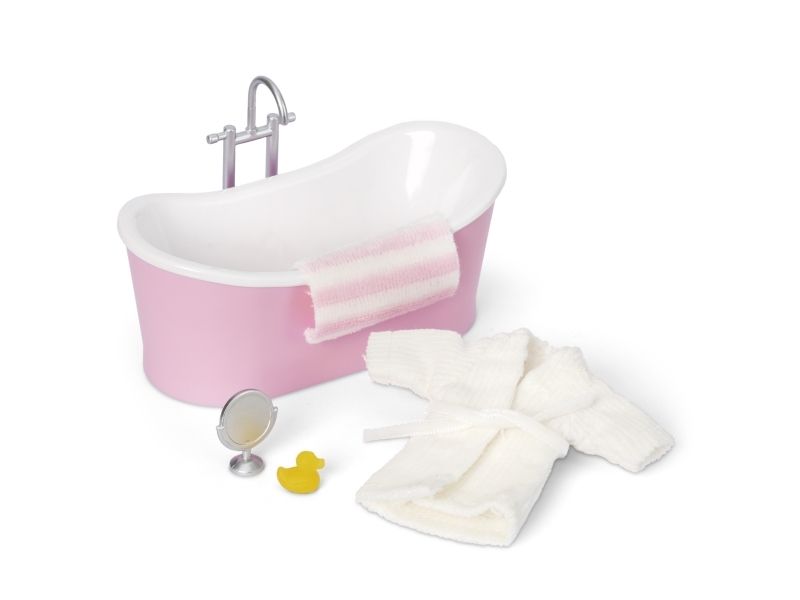 Ett badrum att trivas i! Låt familjen Lundby ta ett varmt bad i badkaret och klä på den mysiga badrocken efteråt. Det snygga badkaret går fint att placera fritt i rummet eller utmed en vägg. I det här badrumssetet ingår förutom badkar och badrock även en liten spegel och en badanka som gärna följer med ner i badet.