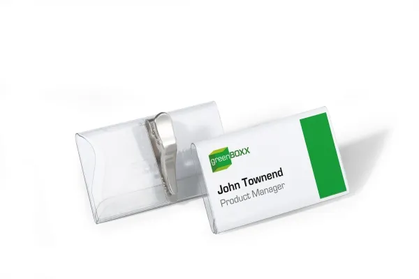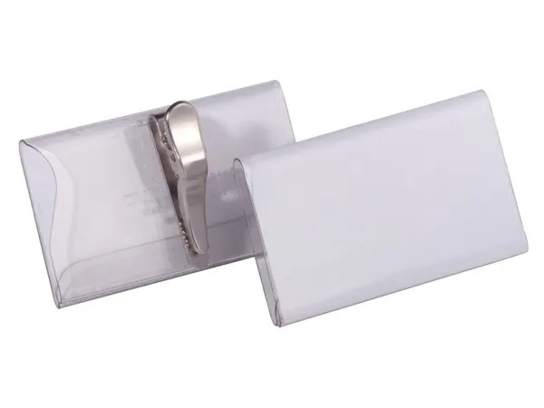 Namnskylt med krokodilklämma 40x75mm (HxB). Är enkel att fästa tack vare den roterbara klämman. Neutrala vita insticksetiketter medföljer. Insticksetiketter på A4-ark för utskrift i skrivare kan beställas separat (art nr 1453). Använd DURAPRINT online som hjälper dig att skriva ut personligt designade insticksark.