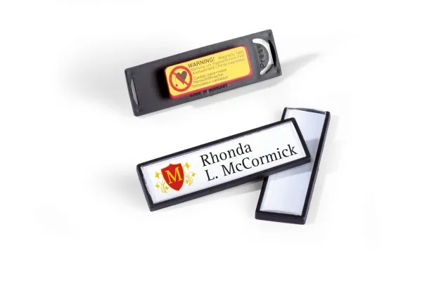 Textilvänlig namnskylt CLIP CARD 17x67mm (HxB) med reptåligt fönster och färgad ram som sitter säkert på plats med hjälp av en magnet (gör inte hål på ömtåliga kläder). Praktisk klämmekanism möjliggör enkelt utbyte av insticksetikett. Kristallklart akrylfönster med förstoringseffekt, som gör det enklare att läsa namnskylten. Insticksetiketter på A4-ark för utskrift i skrivare kan beställas separat (art nr 1461). OBS! Ej lämplig för personer med pacemaker. Använd DURAPRINT online som hjälper dig att skriva ut personligt designade insticksark.
