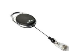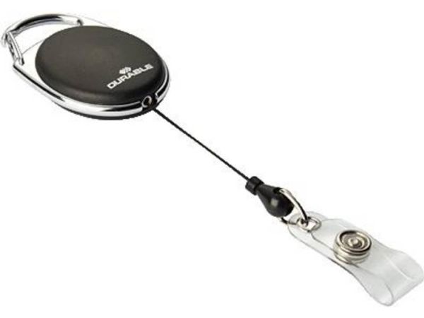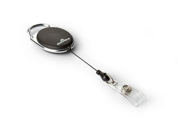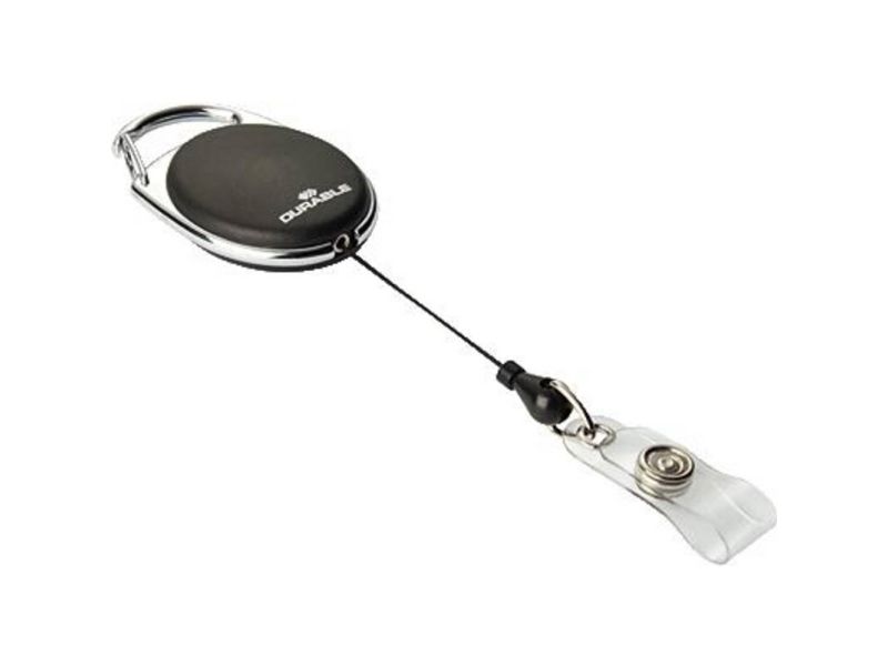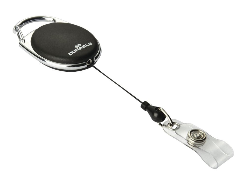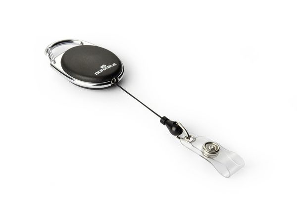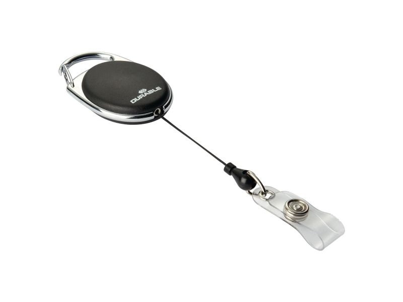 Stylish oval badge reel with metal plated finish and metal clip on the reverse. Provides quick and easy access to security passes and DURABLE name badges with a punched hole for a clip. Press fastener attachment.