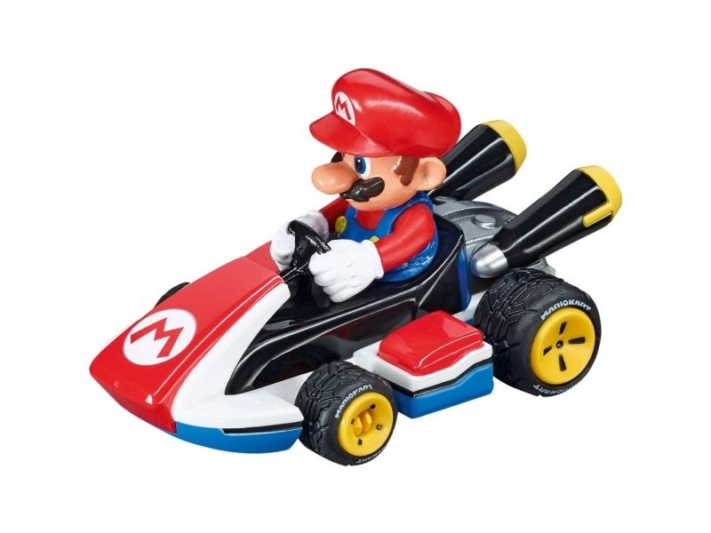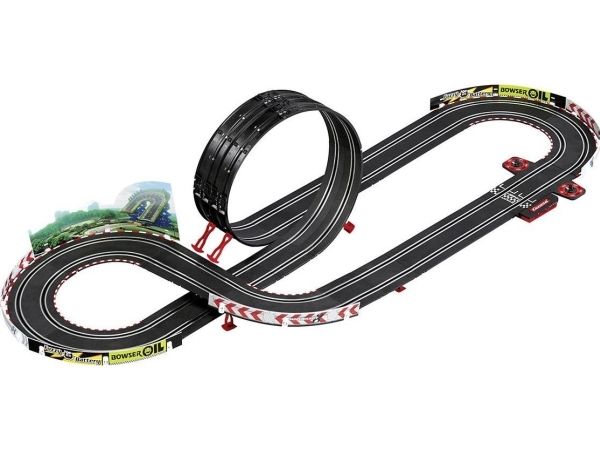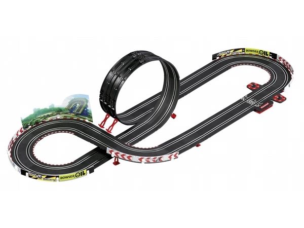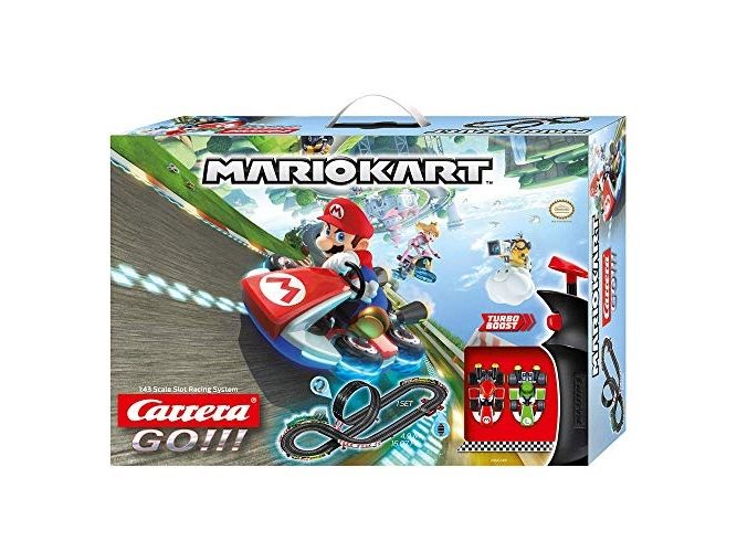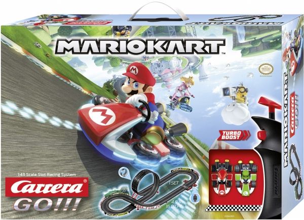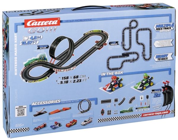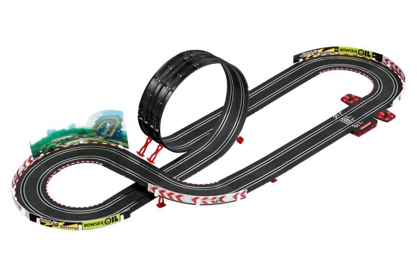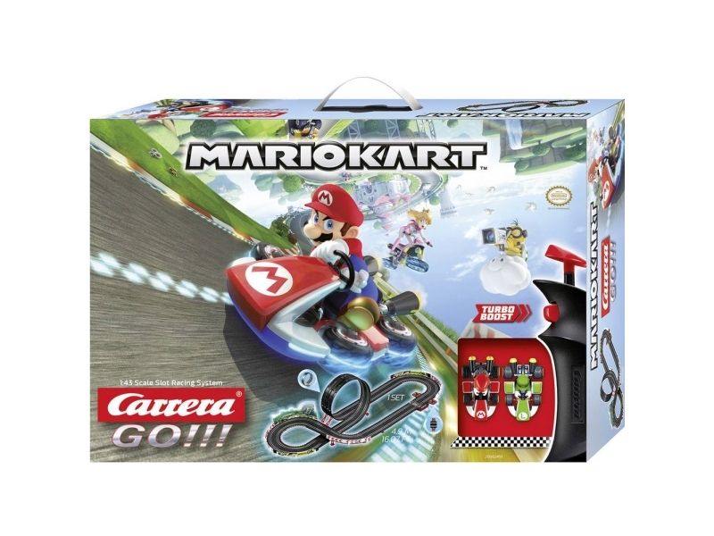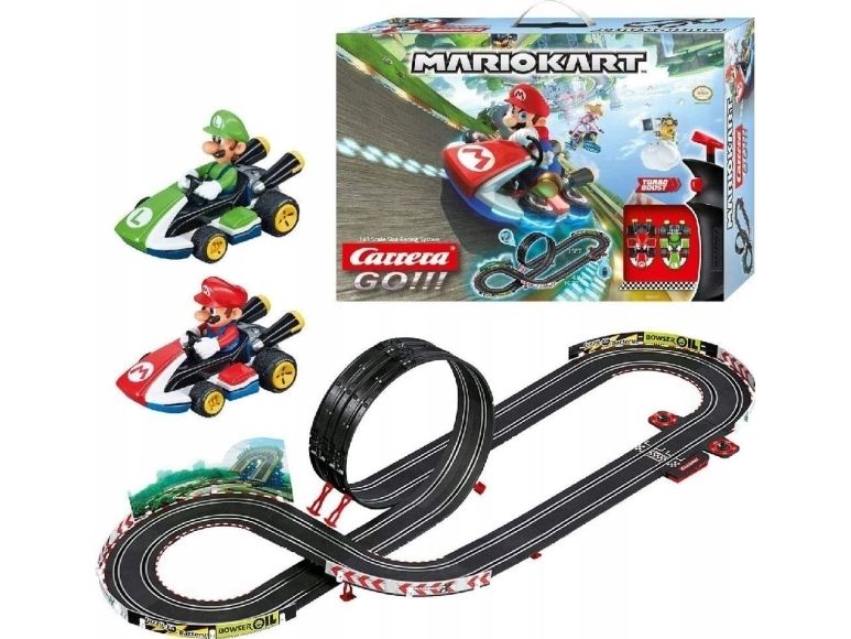 Mario Kart lights up the living room • Carrera GO!!! racing set - Nintendo Mario Kart™ 8 • 2x Carrera GO!!! cars in the set: Nintendo Mario Kart™ 8 - Mario and Nintendo Mario Kart™ 8 - Luigi • 4.9-meter racing circuit with high-speed straights, curve, loop • Dimensions when assembled: 158 x 68cm • Scale of cars: 1:43 • Scale of tracks: 1:43 • Controller with turbo-button • Up to 2 drivers can race simultaneously • Action accessories for great racing fun • Age group: 6+ years It’s now time for the next edition of everybody’s favourite head-to-head between the two plumbing brothers, Mario and Luigi. Carrera bursts onto living room tracks around the world with racing thrills from the well-loved Mario Kart™ video games. Mario and Luigi push themselves to the limit around the 4.9-metre/16.07 ft. Carrera GO!!! as each battles to be the first to get to around the spectacular loop. The Carrera GO!!! Nintendo Mario Kart™ 8 set guarantees racing fun for the whole family