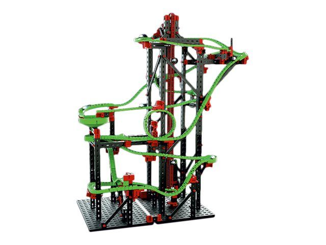 The Dynamic L2 set guarantees even more fun with its action models and three 180° curves. The four high-speed curves with raised side edge let the balls roll at full speed through the curve! The balls simply race through the mechanical cross-over into various tracks. They just fly through the cross-over toward the rotary funnel or over the teeter-totter which releases a ball at the stopping point. The 180° curve lets young architects change the direction of the ball in a tiny space. After passing through the looping and other obstacles, the ball finally arrives at the elevator waiting point. The balls are then brought back up to the top again by the elevator which is operated by an XS motor. The three different action courses offer unlimited fun on the ball obstacle course. The four instructional experiment models also unobtrusively explain the effects of the various physical phenomena (acceleration, mass inertia, the balance of forces, the law of conserving energy, the principle of linear momentum, and the laws of motion).