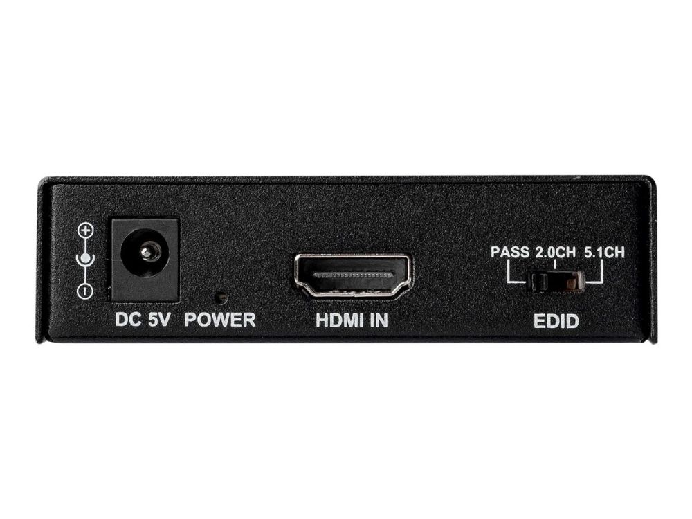 Denna 4K HDMI-ljudextraherare låter dig plocka ut ljud från dina HDMI-videoströmmar för att skapa en distinkt ljudutgång som du kan ansluta direkt till en digital eller analog ljudenhet. Med stöd för HDMI 2.0-specifikationer behåller extraheraren 4K 60 Hz-upplösningar för att leverera en sömlös videoupplevelse. 4K-videoprestanda HDMI-ljuddelaren stöder videoupplösningar upp till 4K 60 Hz (3 840 x 2 160) och hög videobandbredd upp till 18 Gbps. Den stödjer även HD-video-genomströmning (HDR) som ger dig levande bilder med otrolig kontrast, ljusstyrka och färg samt högre ljusstyrka jämfört med vanlig digital bildbehandling. Maximal kompatibilitet Integrera enkelt HDMI 2.0-enheter, till exempel din nya 4K Blu-ray-spelare, med din befintligaljudutrustningeller skrivbordshögtalare. Extraheraren isolerar och extraherar ljudsignalen från din HDMI-kabel och låter dig mata ut till digitalt optiskt ljud eller dubbla RCA-ljudenheter. Den integrerade EDID-hanteringen stöder följande ljudlägen: 2-kanal, 5.1-kanal och genomströmning.\ Den HDCP-kompatibla HDMI-ljudextraheraren är kompatibel med dubbla RCA-kompositadaptrar, vilket ger dig flexibiliteten att integrera ljudet från din HDMI-källa i 3,5 mm ljudapplikationer med hjälp av MU6MMRCA" text="MU6MMRCA, MU3MMRCA" text="MU3MMRCA eller MUFMRCA" text="MUFMRCA (säljs separat). Den kompakta extraheraren har ett litet fotavtryck som diskret smälter in bland din hårdvara för ett enhetligt utseende.