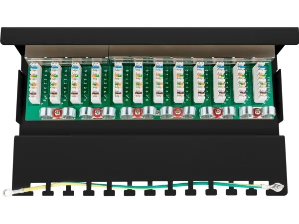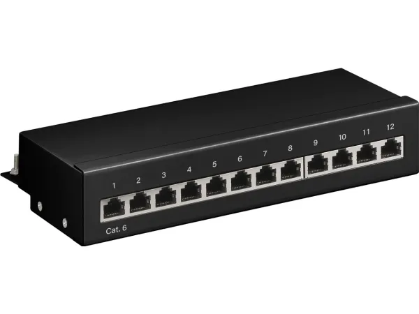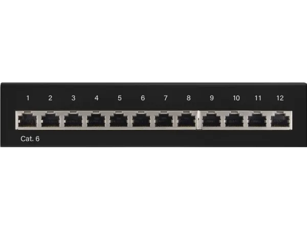 Patchpanel med 12 portar och RJ45-uttag för anslutning av färdiga CAT-6-nätverkskablar.