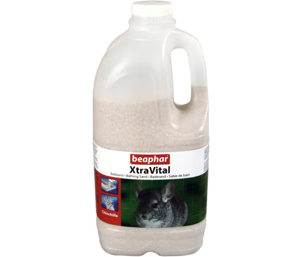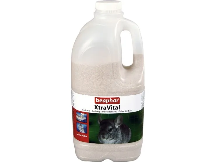 XtraVital Chinchilla badsand. Sanden absorberar fett och fukt i huden och ger en vacker päls. XtraVital badsand har en grov struktur så att den lätt glider genom pälsen. Nästan 100 % dammfri. Användning: Placera en liten balja fylld med 2 cm XtraVital badsand i buren i 10 minuter dagligen.