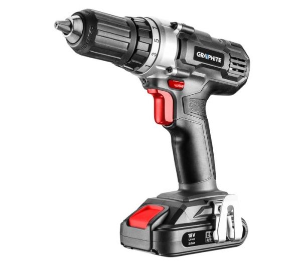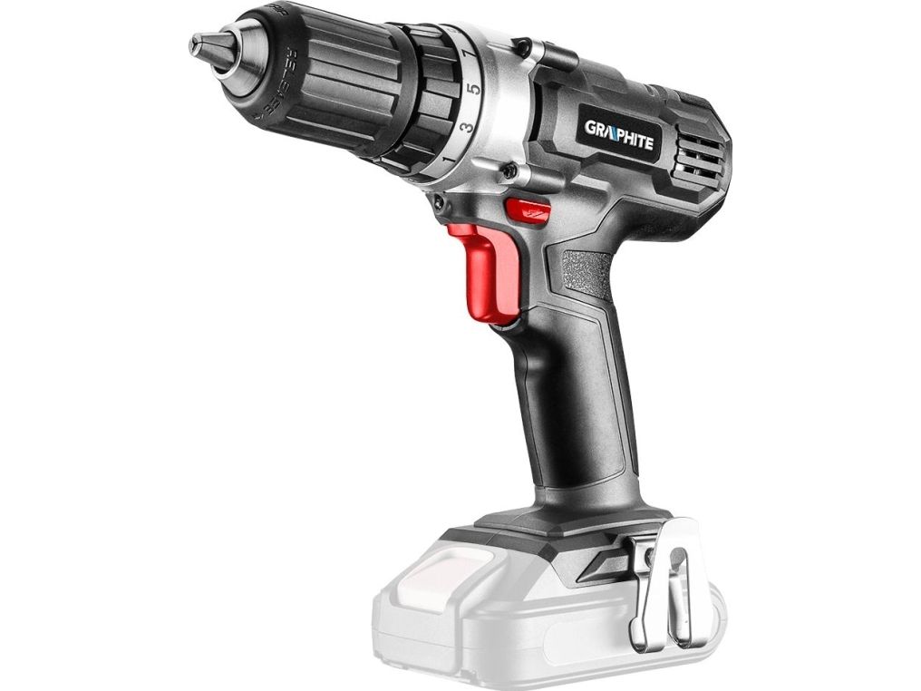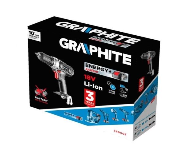 GRAPHITE two-gears cordless drill, compatible with 18V Li-Ion GRAPHITE Energy+ batteries. The power tool has rotary speed adjustment and has been equipped with a direction selector switch. The keyless chuck allows the use of accessories with a diameter of 2-13 mm. The maximum spindle speed is 350 rpm for first and 1250 rpm for second gear. The maximum torque is 35 Nm (soft) / 55 Nm (hard) and can be adjusted via a 19-degree clutch with an additional drilling option. The device is equipped with an electric motor brake and automatic spindle lock. Automatically activated LED light illuminates the workplace. The ergonomic shape of the handle and the compact design of the drill allow for comfortable work even in difficult conditions. The handle has been covered with anti-slip material, so that the power tool lies firmly in your hand. The planetary gear was made of high-grade steel.