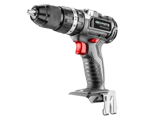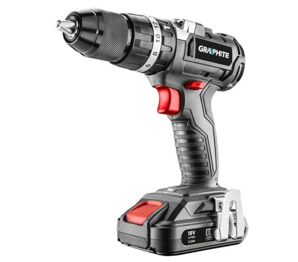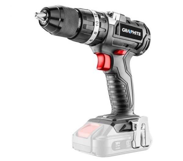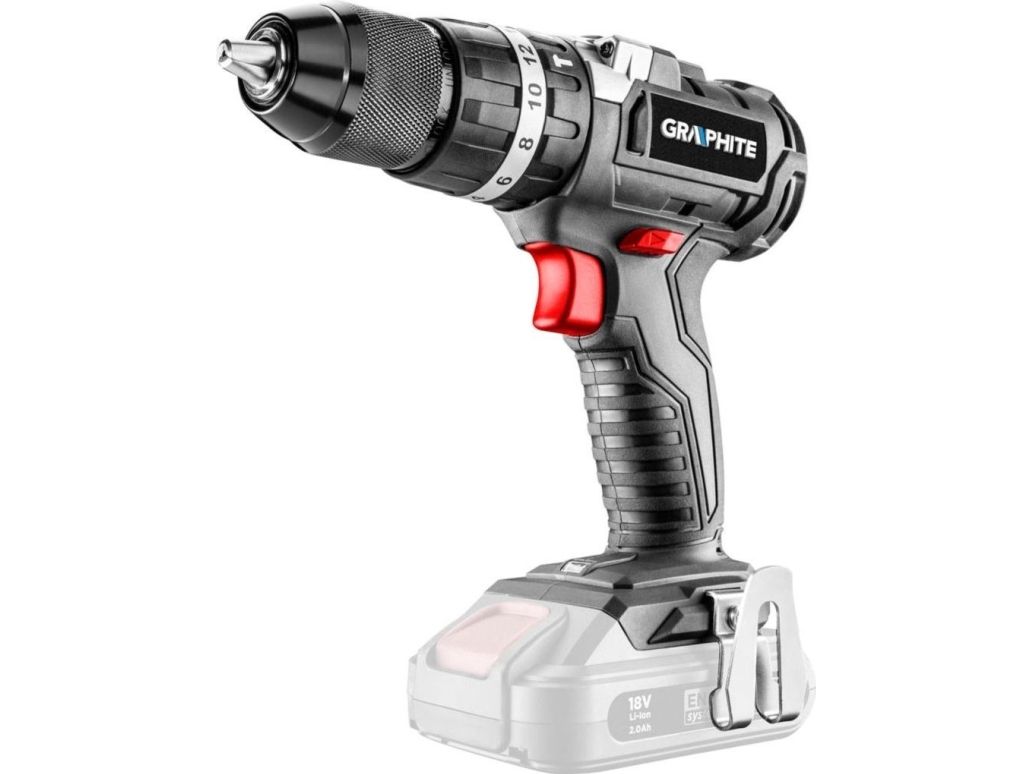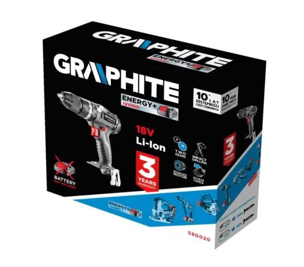 A two-speed GRAPHITE cordless drill, compatible with 18V Li-Ion GRAPHITE Energy+ batteries. The device construction uses a modern and efficient brushless motor, which in comparison with brush designs is characterized by a longer time of work on one charge, greater control over rotational speed and smaller dimensions, which translates into a more compact design of the entire device. In addition, this kind of motor is more resistant to harsh conditions as high dust, and it better dissipates the heat, which allows for more intense work under a greater load. The planetary gear was made of high-grade steel. The maximum speed in the first gear is 500, and in the second one is 1700 revolutions per minute. The maximum torque is 38 Nm (soft screwdriving) / 58 Nm (hard) and can be adjusted via a 16-speed clutch with additional drilling and hammer drilling options. The self-tightening metal chuck allows the use of accessories with a diameter of 2-13 mm. The device is equipped with an electric motor brake and automatic spindle lock. LED, automatically activated, illuminates the workplace. The ergonomic shape of the handle and the compact design of the cordless drill allow for comfortable work even in difficult conditions. The handle has been covered with anti-slip material, so that the power tool lies firmly in your hand.