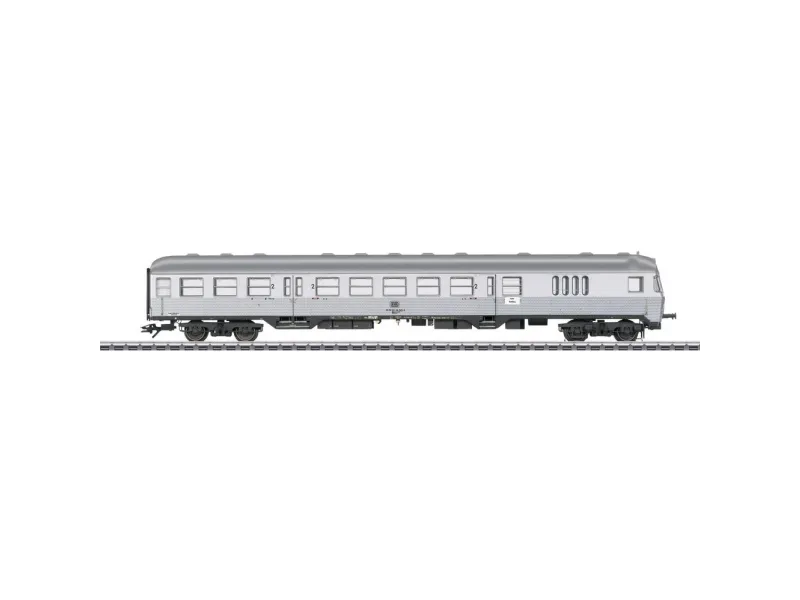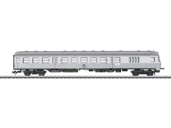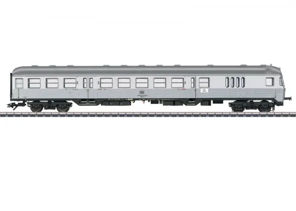 Prototype: German Federal Railroad (DB) cab control car (type BDnrzf 740), 2nd class with a baggage area. "Silberling" / "Silver Coin" design. Modernized "Karlsruhe" end with a baggage area. Based at Frankfurt am Main. The car looks as it did around 1975.