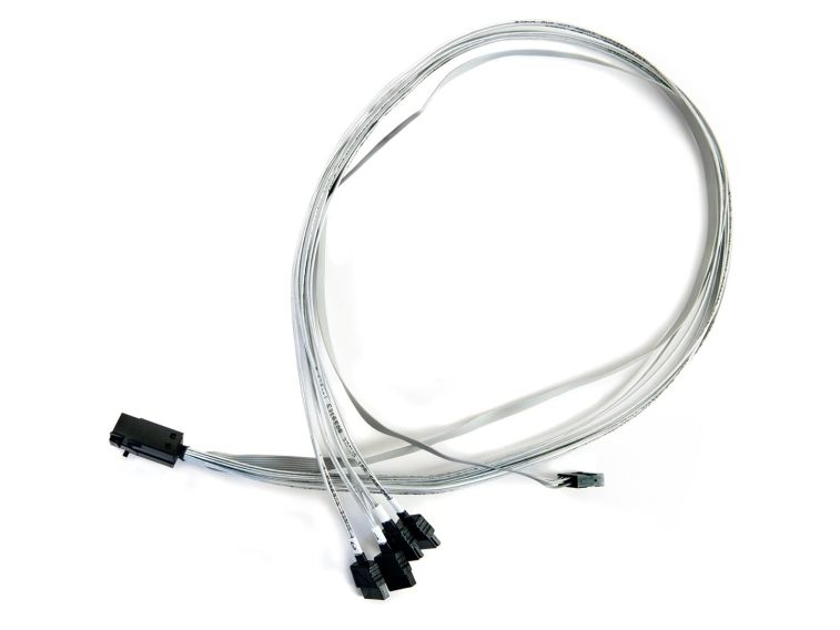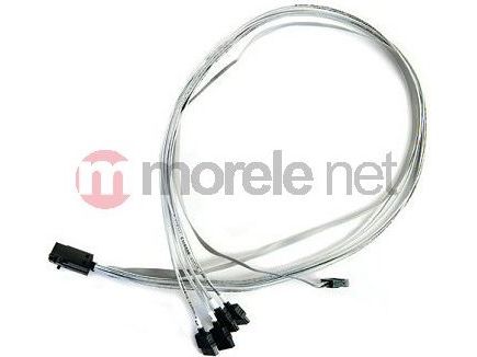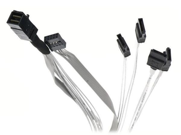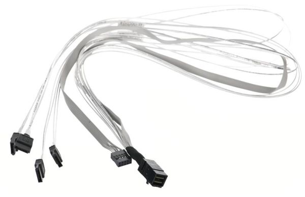 The Adaptec ACK-I-HDmSAS-4SATA-SB-.8M is an internal mini serial attached SCSI HD x4 (SFF-8643) to (4) x1 Serial ATA (adapter based) fan-out cable with sideband signals (SFF-8448). It measures 0.8 meters and is used for connecting a SAS/SATA adapter to SATA disks, or a SAS/SATA backplane.