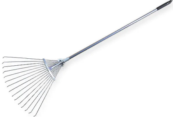Adjustable leaf rake made of aluminum. Assigned for raking up leaves and small grass. Adjustable head width: from 19cm to 55cm. The size of extended rake: Height-156cm Width-55cm The size of assembled rake: Height-121,5cm Width-19cm