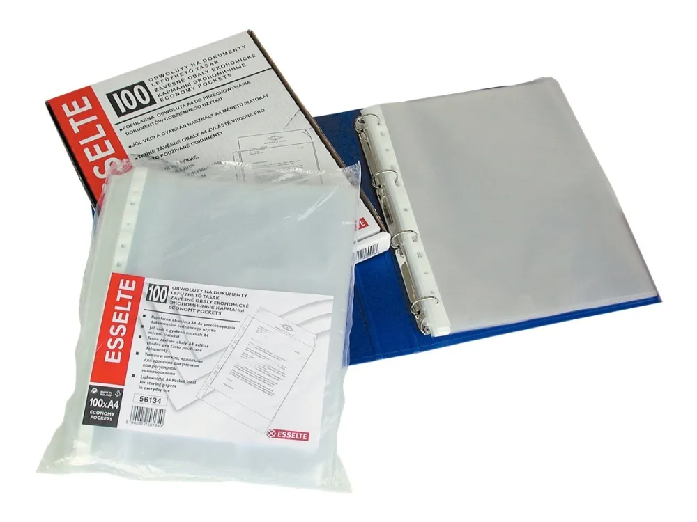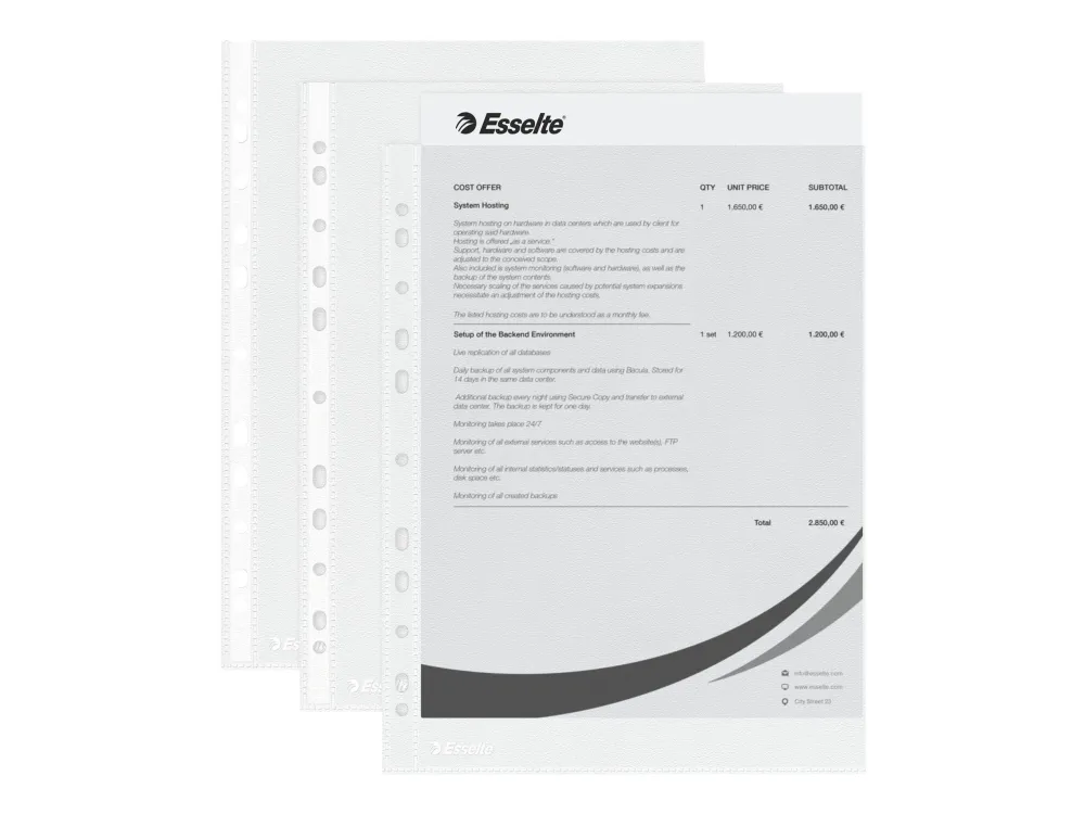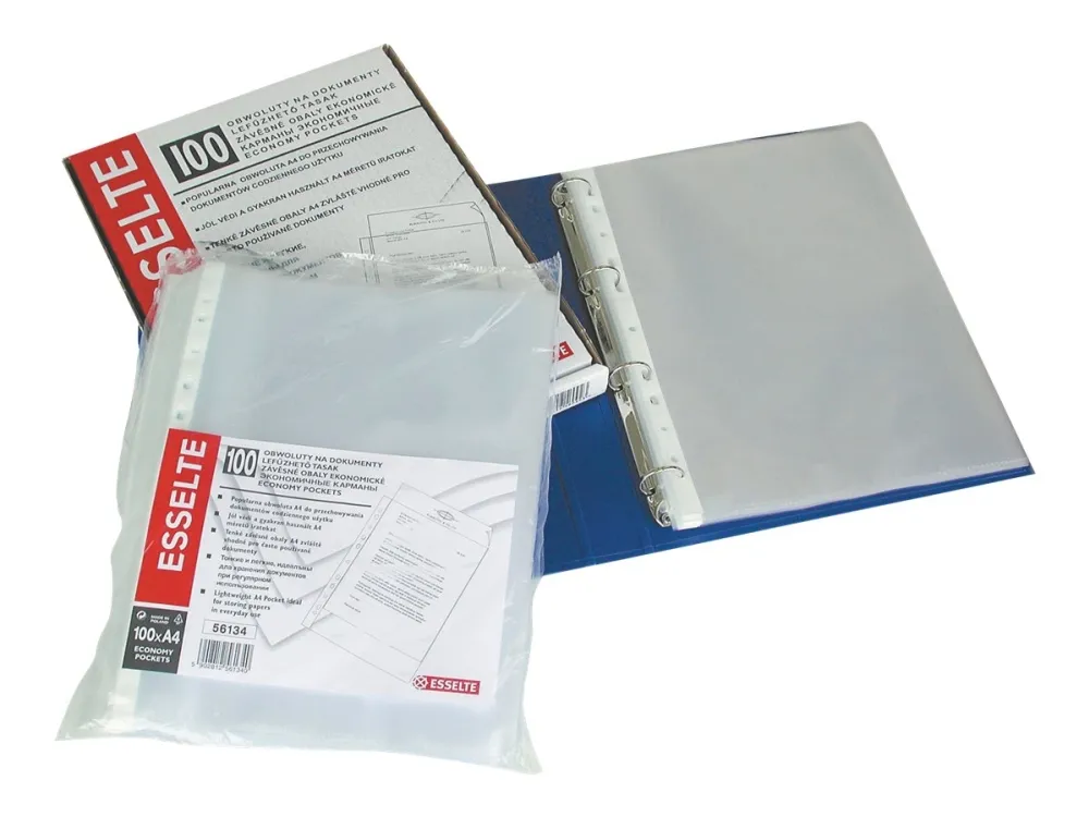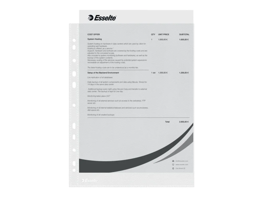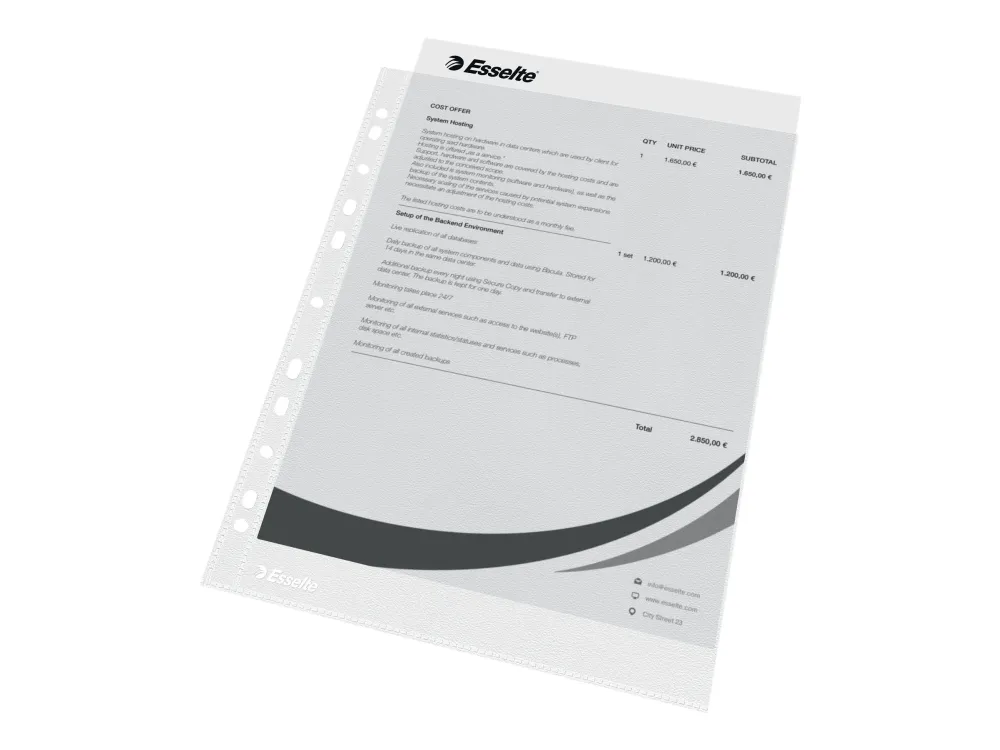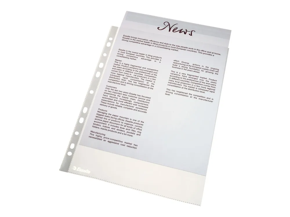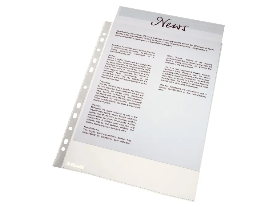 Ficka Esselte. Kvalitetsficka för dagligt bruk. Multi-stansad hålremsa tillåter praktisk förvaring av dokument i gaffelpärmar och ringpärmar.