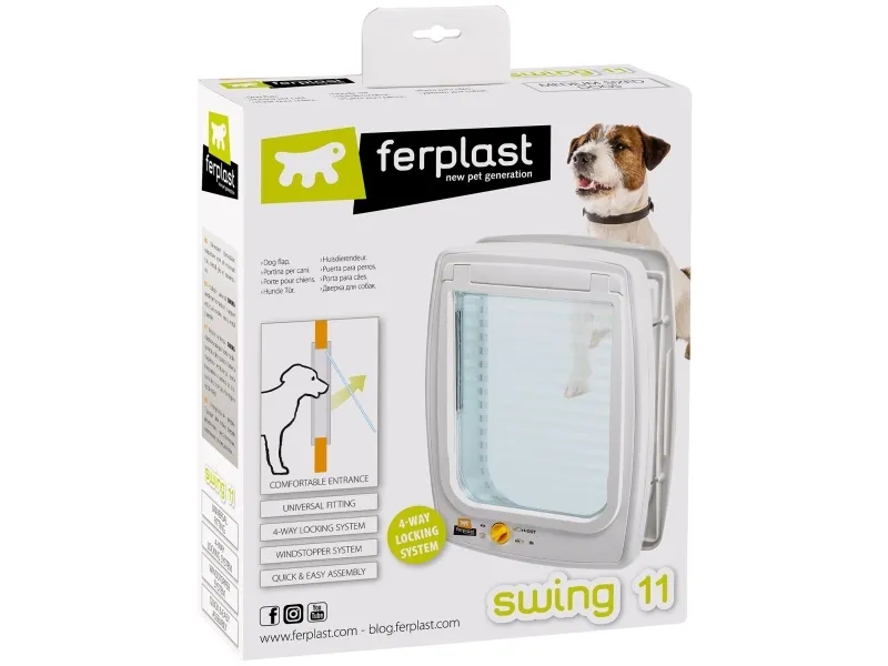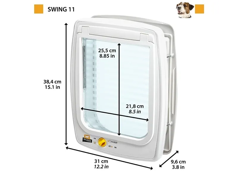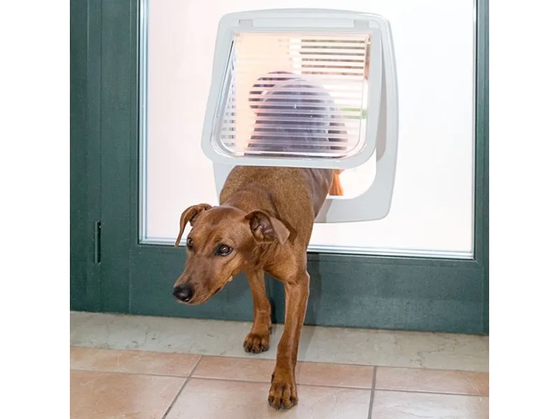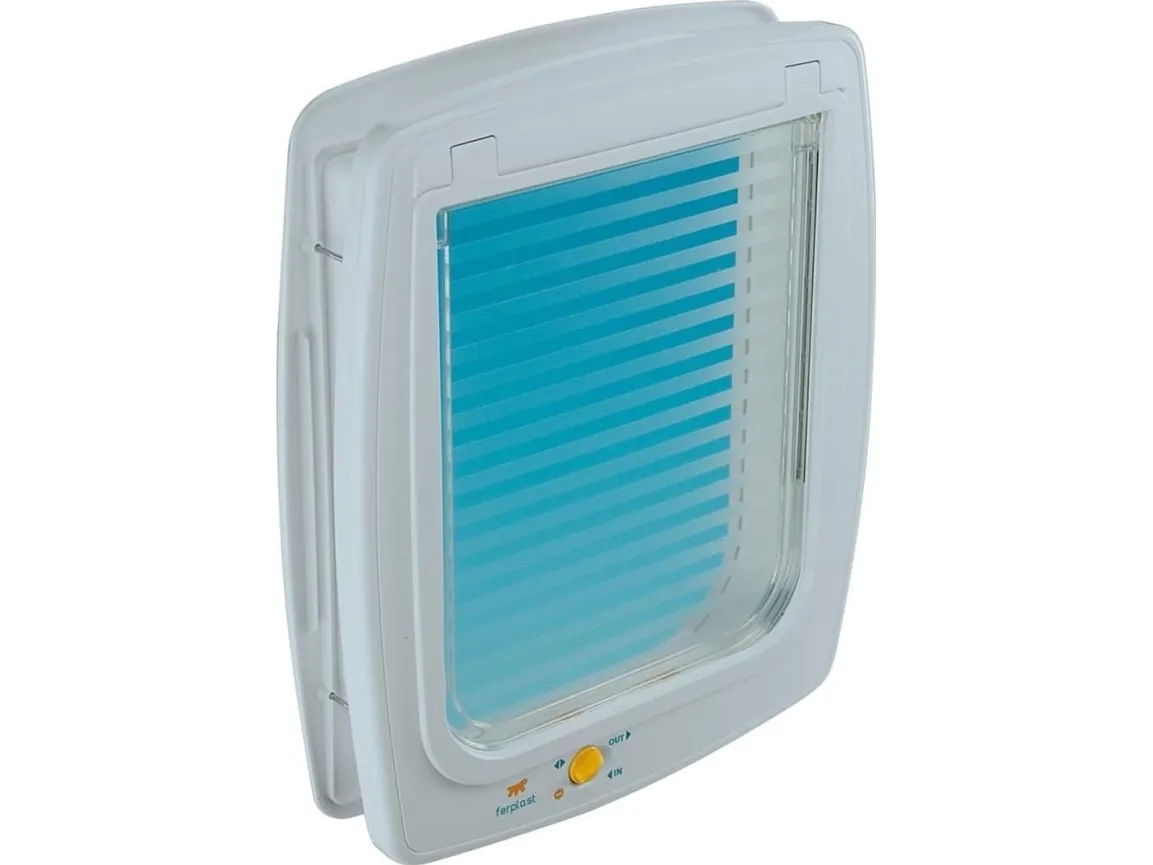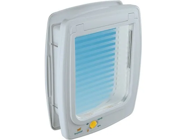Lucka utrustad med vindstoppssystem för att minska drag. Fyrvägs så man kan välja helt öppen, helt stängd, endast ingång eller endast utgång. Har ett större djup (5cm) som är bra om man vill montera i tjockare dörrar eller väggar.