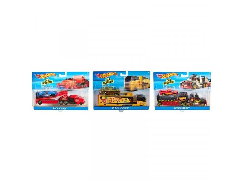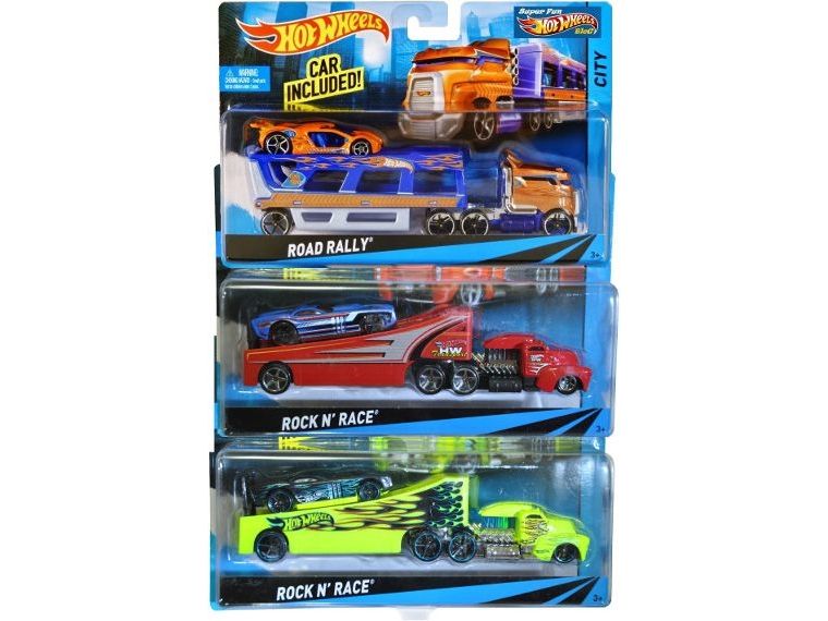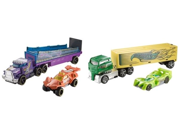 These cool Hot Wheels® hauling rigs with car sets deliver inspiring ways to play -- push around, load and go or hit the track for racing thrills! Each rig comes with a sports car and features big action fun and dynamic detailing. There are many radical rig models to choose from, so pick your favourite then load up and hit the road for new, powerful adventures!