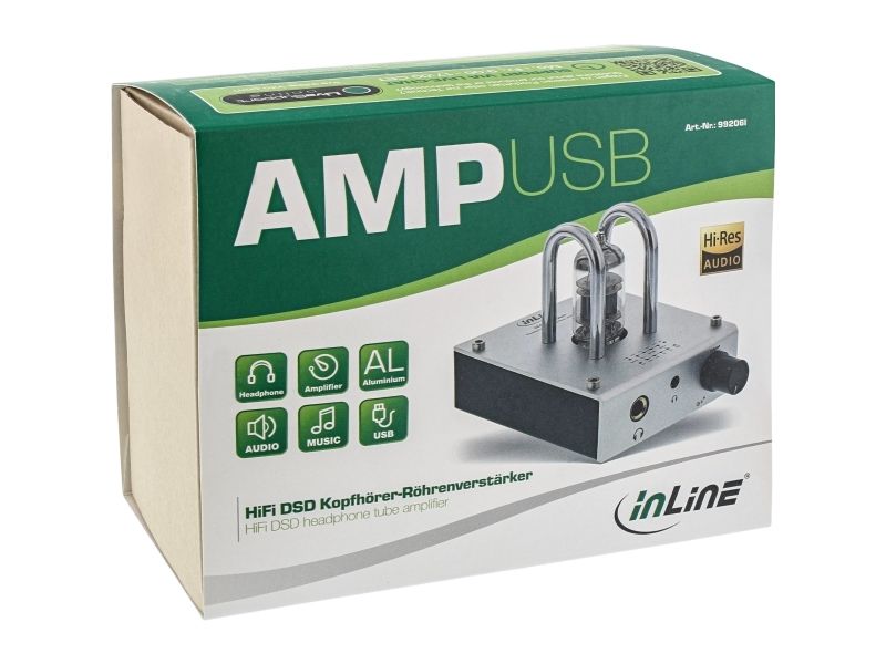 The InLine® AmpUSB 384KHz/32bit DSD USB Audio DAC with Vacuum Tube amplifier is an ultra-mastering grade digital audio playback system. It is capable of converting high resolution PCM audio (up to 384 kHz) and DSD audio (up to 128x DSD). The DAC allows you to bypass your computer's soundcard or headphone output and send digital audio signal through the USB interface. With this perfect digital interface between your computer and the music system, the sound quality is pushed to another higher level in your overall music environment. The amplifier tube provides for a soft and pleasant sound character, the signals are quasi-analog amplified and have a more natural sound.