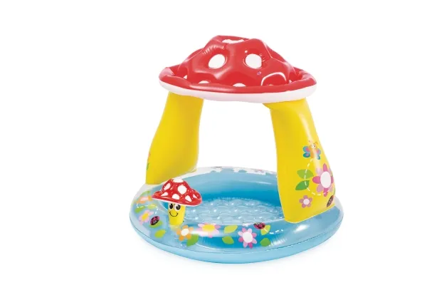 - Baby’s own pool with built-in mushroom sunshade - A soft inflatable floor allows for gentle play - Repair patch