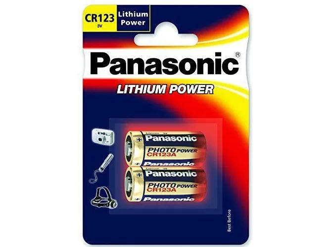 Panasonic CR 123. Battery type: Single-use battery, Battery technology: Lithium, Battery voltage: 3 V. Width: 17 mm, Depth: 17 mm, Height: 34.5 mm