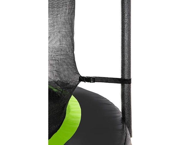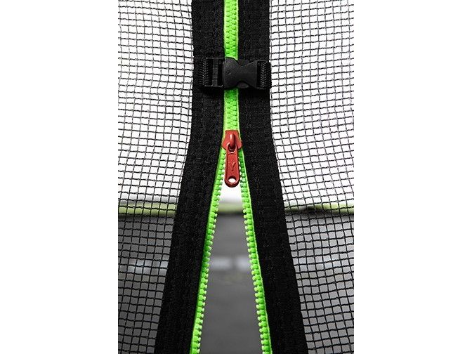 Trampolinen är omgiven av ett nät på 180 cm höjd. Maskorna har en diameter på 3 mm för att förhindra oavsiktlig handinmatning och möjliggöra säkert stöd.