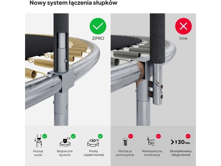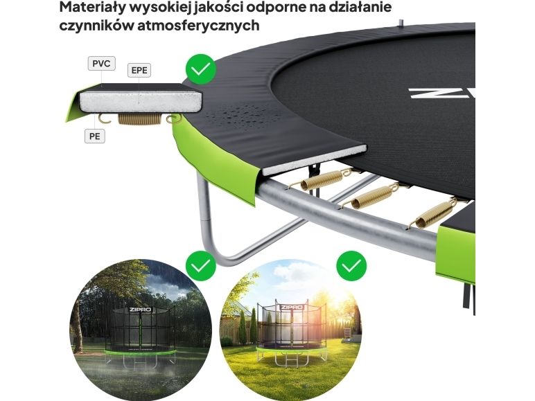Säkerhet och kvalitet är de högsta prioriteringarna när det gäller konstruktionen av ZIPRO-trampoliner. Tack vare dessa egenskaper ges möjlighet till skadefri användning under många år.