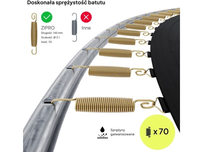 ZIPRO JumpPro-intramploner har 70 tättsittande fjädrar, 145 mm långa och 3,1 mm tjocka. Antalet och placeringen ger kraftiga studs och utmärkt dämpning.