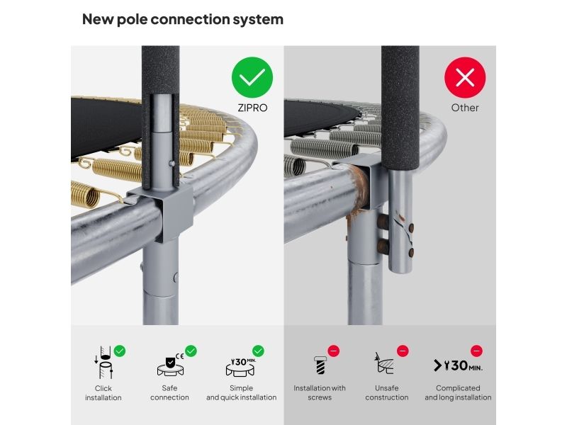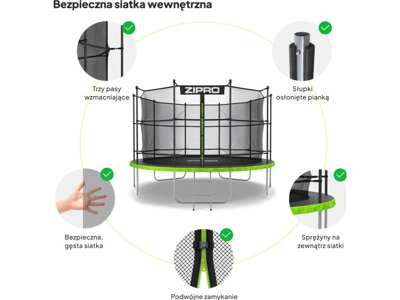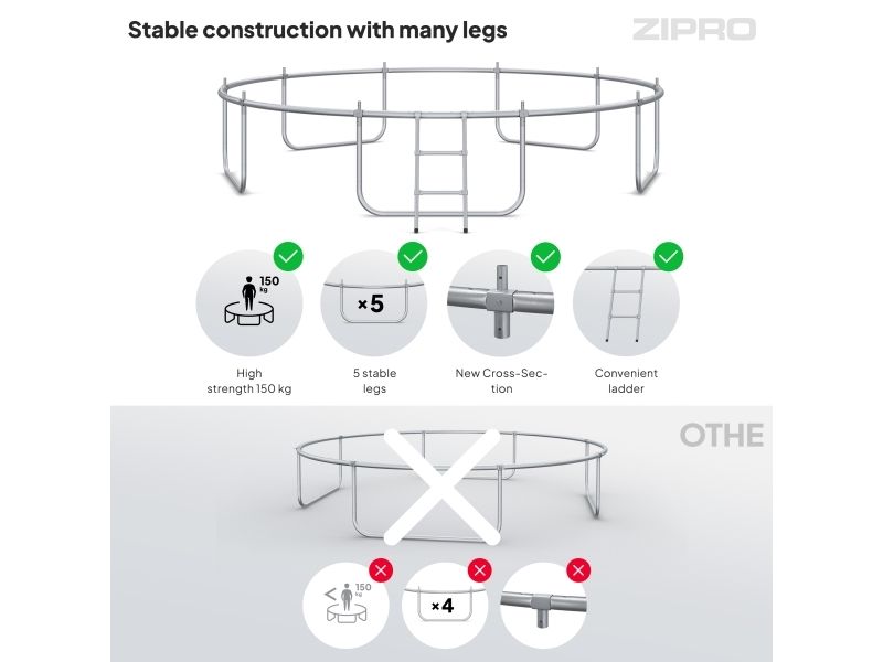 Trampolinerna från ZIPRO är försedda med ramförstärkningar för extra stabilitet. Fullständigt avstånd utan mellanrum mellan nätet och mattan ger ingen risk för oavsiktlig kontakt med trampolinens ram.