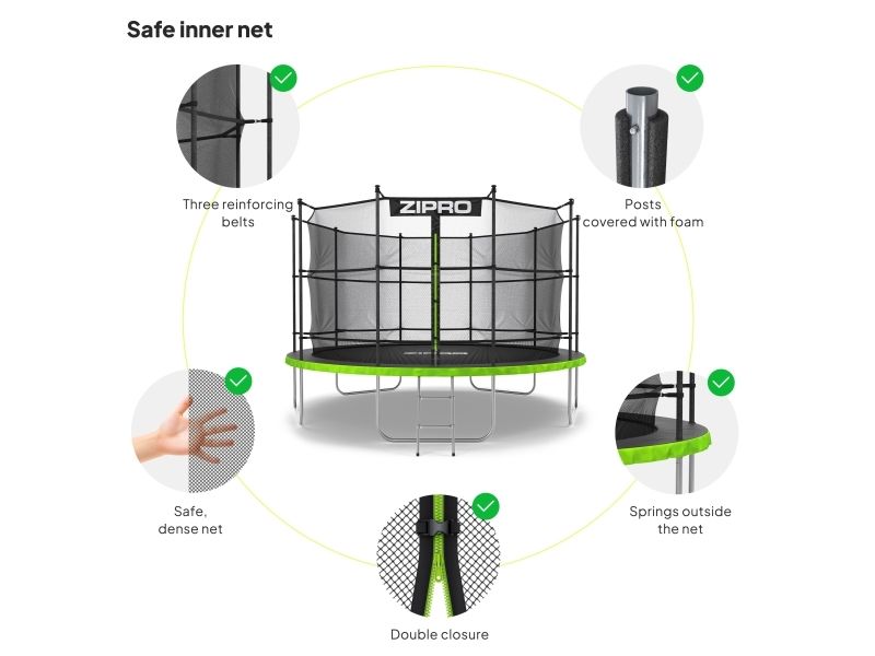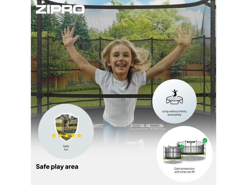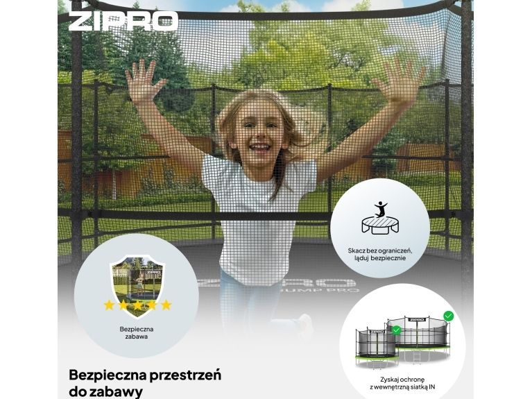 Trampolin ZIPRO JumpPro IN är ett bra sätt att ha säker utomhuslek. För att se till att barnen har roligt och föräldrarna känner sig lugna, har ZIPRO JumpPro IN designats kompromisslöst med ett nät på insidan för att säkerställa att allt som behövs för nöjet finns på plats. Dess lösningar skapar helt säkra förhållanden, även för de yngsta.