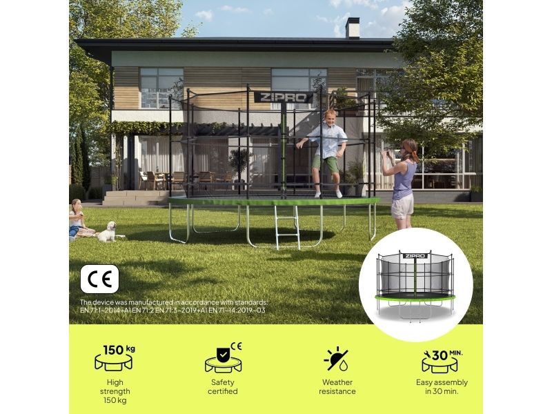 Alla ZIPRO-trampoliner uppfyller strikta europeiska säkerhetsnormer, såsom EN71-1, EN71-2 och EN71 för konstruktionens hållbarhet och materialens kvalitet. Genom att välja en modell från ZIPRO garanteras du att inte bli besviken, inte ens vid extrem användning. De har CE-certifiering, vilket intygar både hög kvalitet och att de är avsedda för konsumentbruk. När du väljer utrustning med dessa certifikat kan du vara säker på att de har testats noggrant av en extern instans som gett en oberoende bedömning av dess funktion.