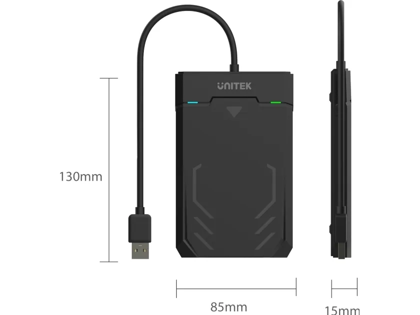 Unitek Y-3036 är ett mångsidigt 2,5" lagringskabinett som är utformat för att sömlöst rymma din hårddisk eller solid state-enhet. Med en kompakt längd på 30 cm förenklar den här USB 3.1-kabelintegrerade enheten både anslutning och dataöverföring och uppnår en hastighet på 6 Gbit/s. Kabinettet har en LED-indikator för enkel övervakning och uppfyller Plug-and-Play-standarderna, vilket garanterar en problemfri installation. Den automatiska vilolägesfunktionen förbättrar energieffektiviteten och bidrar till kostnadsbesparingar över tid.