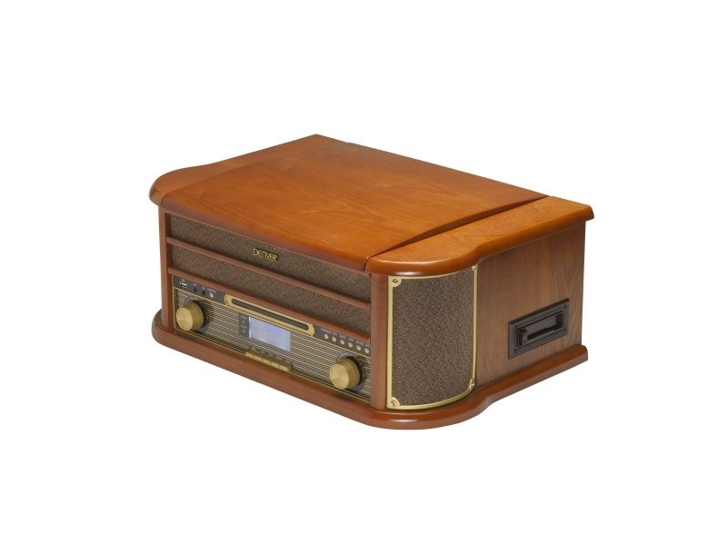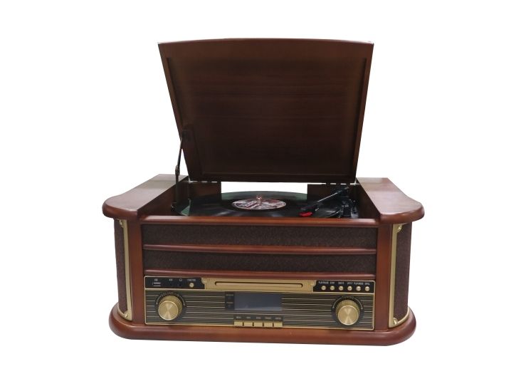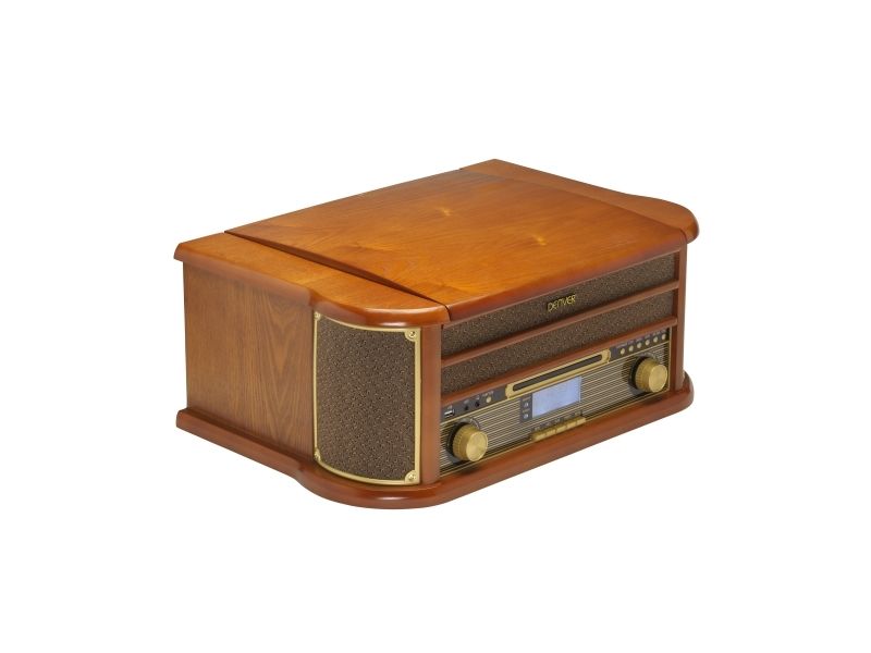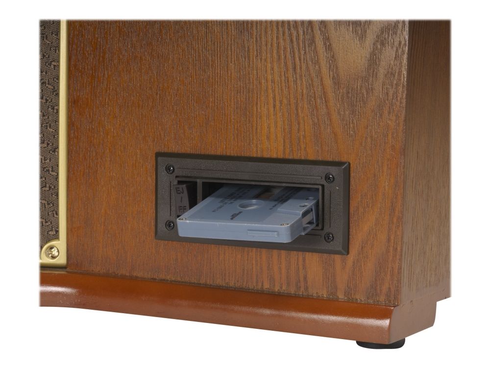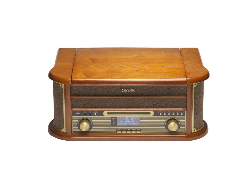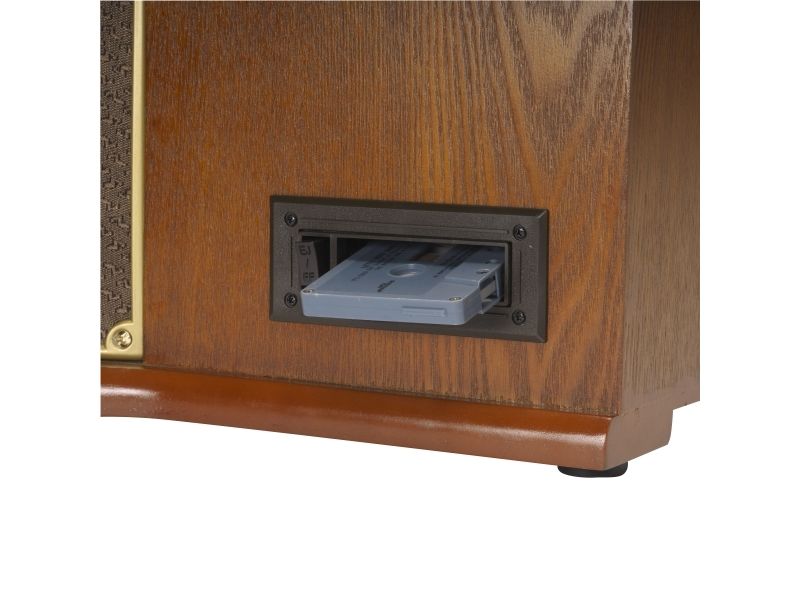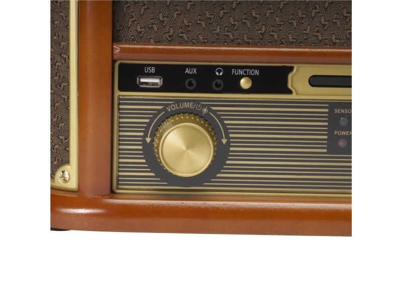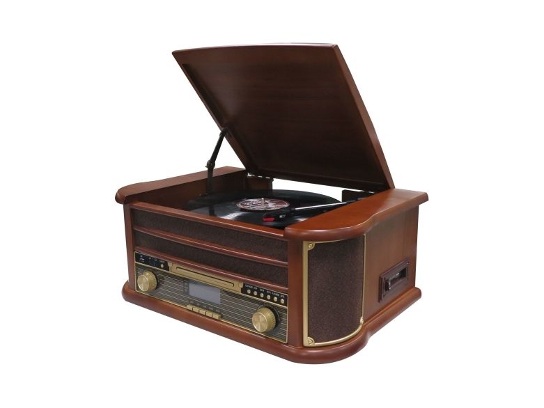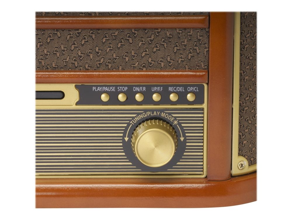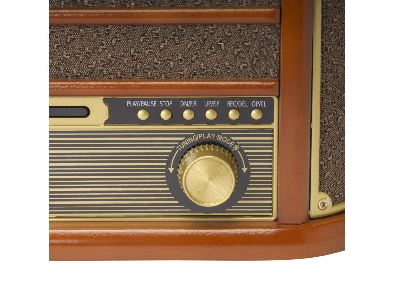 - Wooden retro music center with turntable (3-speed 33-1/3, 45 78 RPM) - FM/AM radio - DAB radio - CD with MP3 support - USB MP3 play back - Cassette player - USB recording LP, CD and cassette - Built-in amplifier 2x2.5W RMS - AUX on front - Blue LCD display - Diamond ceramic needle - Material solid wooden case