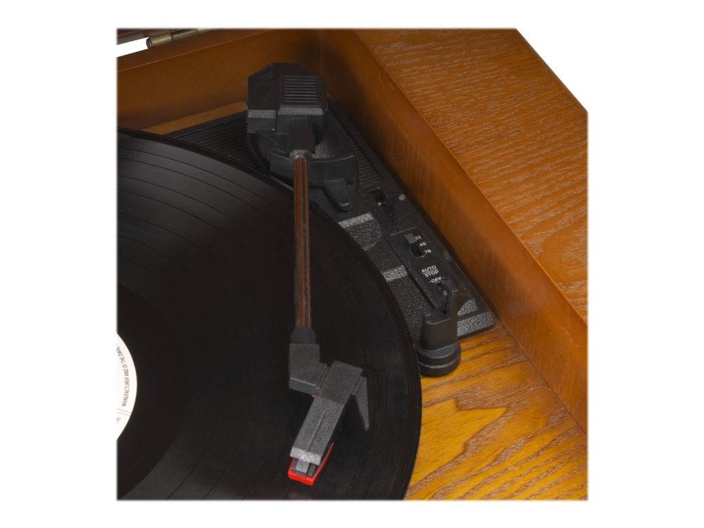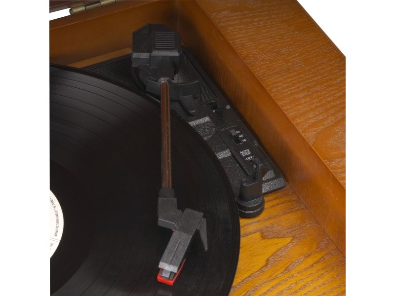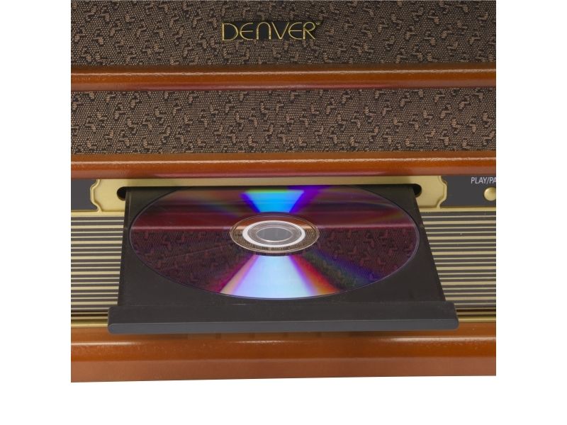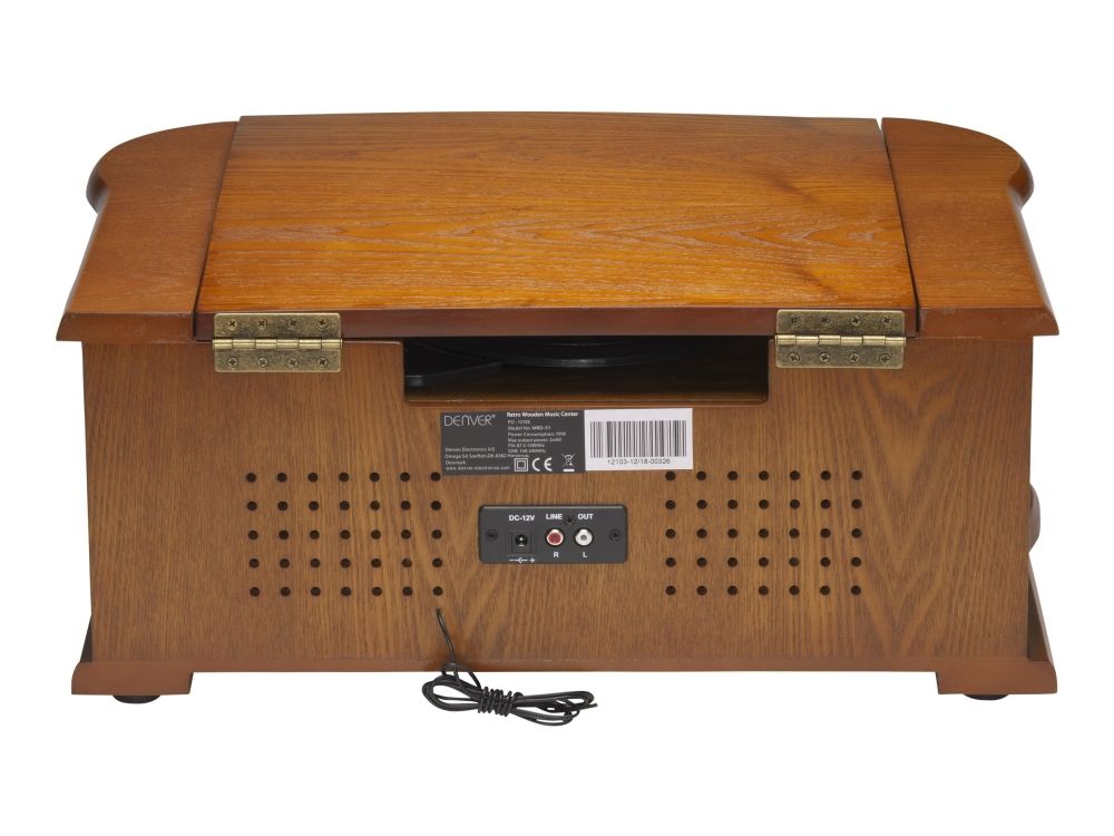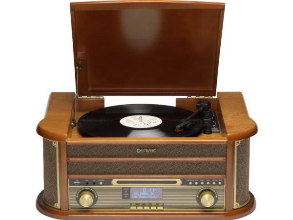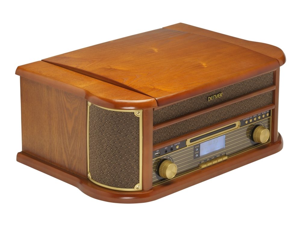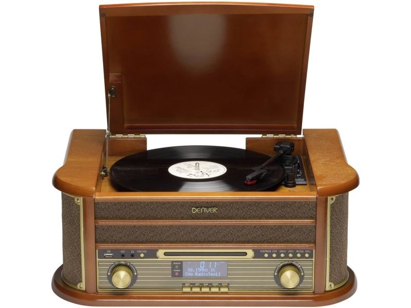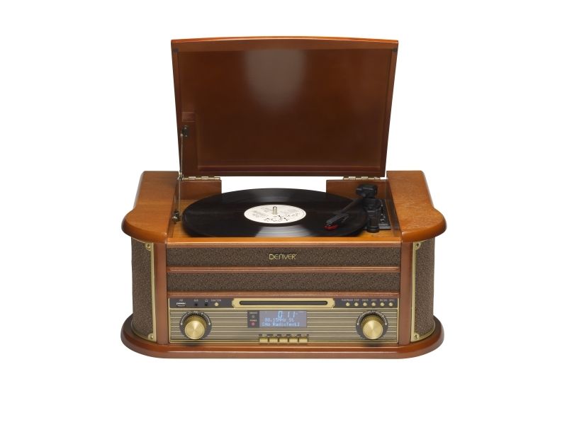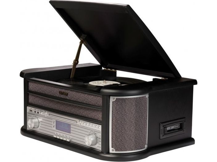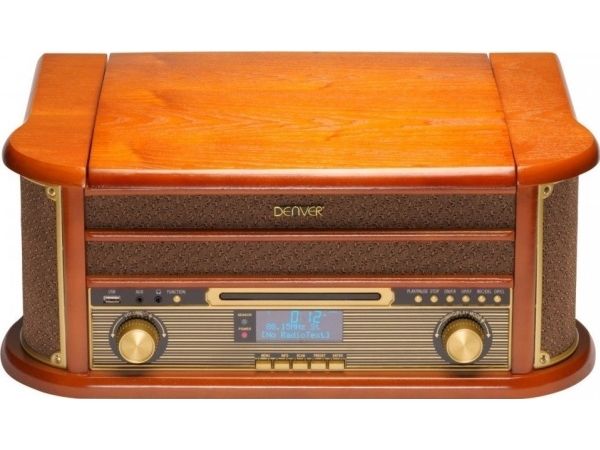 - Wooden retro music center with turntable (3-speed 33-1/3, 45 78 RPM) - FM/AM radio - DAB radio - CD with MP3 support - USB MP3 play back - Cassette player - USB recording LP, CD and cassette - Built-in amplifier 2x2.5W RMS - AUX on front - Blue LCD display - Diamond ceramic needle - Material solid wooden case
