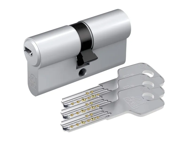 fornikletDet kvalitetsfulde profil-dobbeltcylinder af mærket BASI med vendenøgle gør dørlåsen til dit hus- eller indgangsdør. Borecylinder til fordybning består i Kern af 8 direkte spærreleelementer på 2 forskellige niveauer og sørger dermed for mere sikkerhed. På grund af den ekstra picing-, udbore- og slagbeskyttelse giver dobbeltcylinderen den bedste beskyttelse og gør det derved svært for indbrudstyve at bryde låsen med vold eller at knække den. Profilcylinderen er udstyret med et forskelligt lukkende system. Det betyder, at kun de 3 medleverede skruenøgler passer. Ved hjælp af koden på nøglen kan der til enhver tid tages erstatningsnøgler hos din regionale nøgletjeneste. Ved produktionen af den robuste cylinder er der særligt fokus på højeste kvalitet. Præcis fremstilling og kontrol sker i henhold til din standard 18252:2006-12 / din 18252-10 / din en 1303:2005-04 Reg. nr. 34v05.