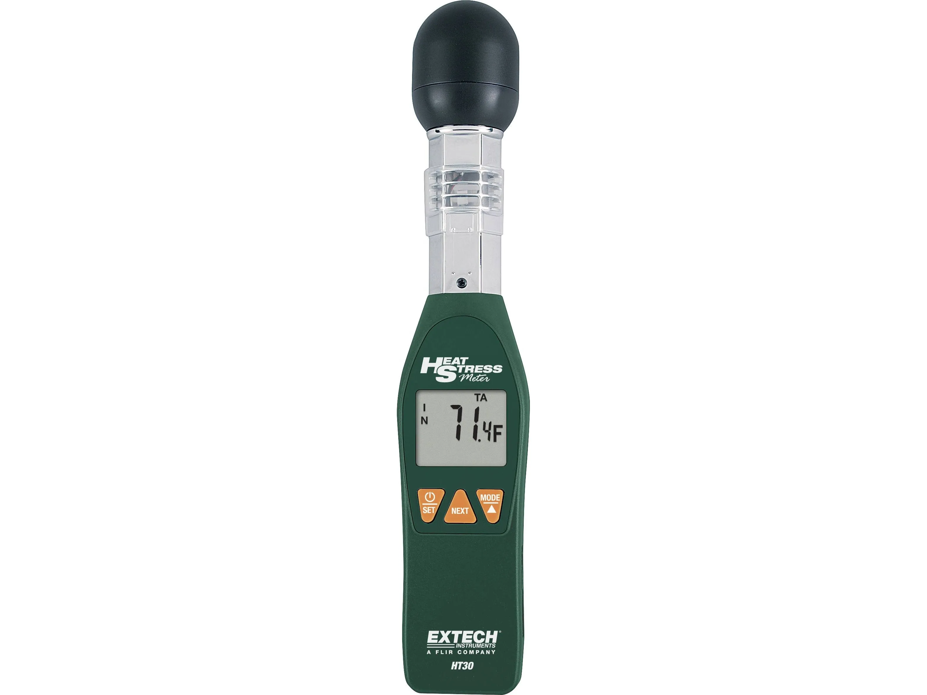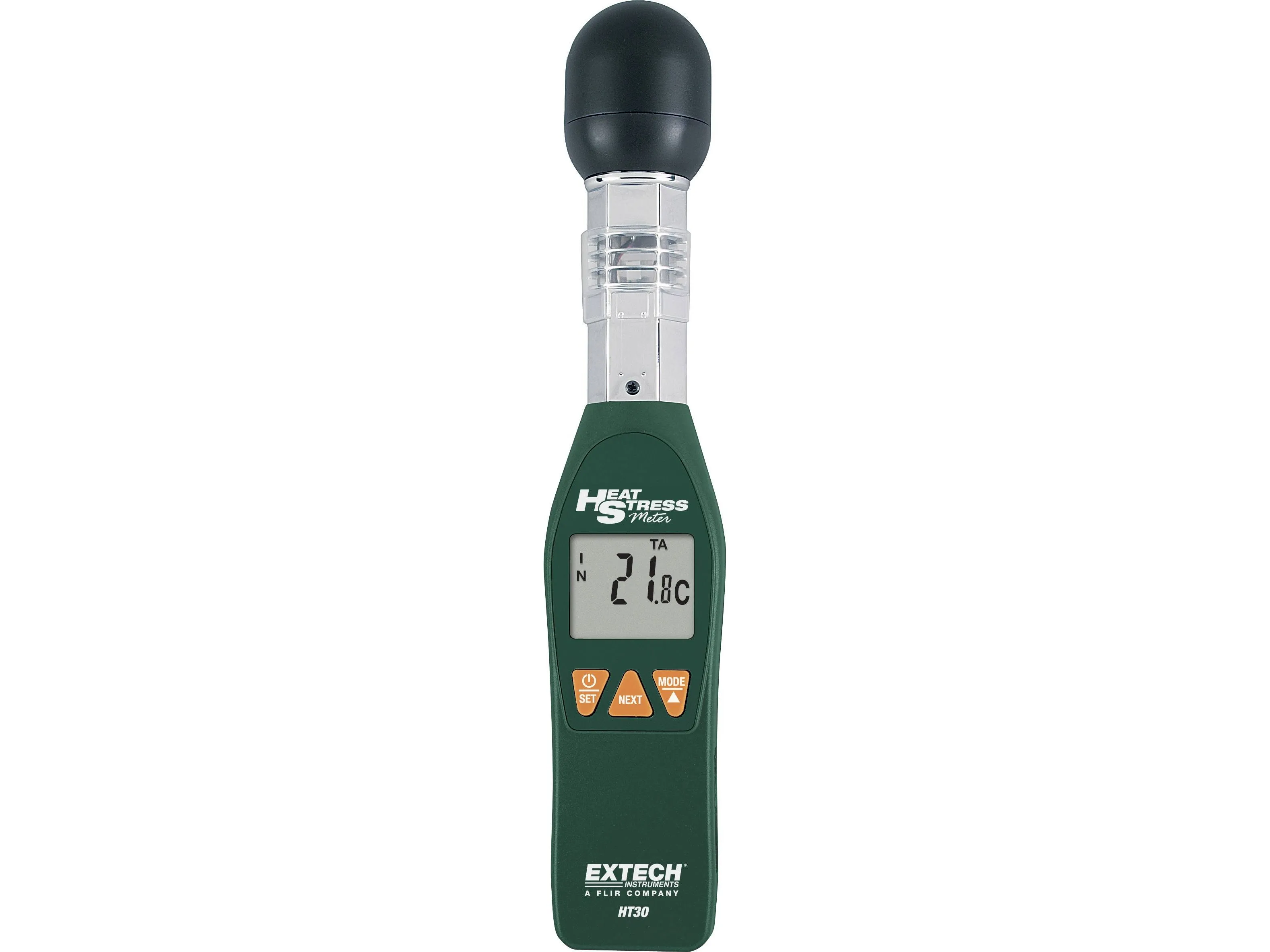 HT30Dette måleapparat måler og viser varmestress-indekset (WBGT), som beskriver varmeoplevelsen, når man kombinerer luftfugtighed med temperatur, luftstrømning og direkte eller udstrålende sollys. Black Globe (sort kugle) temperatur (TG) kontrollerer virkningen af direkte solstråling på en ubeskyttet overflade. Den måler også lufttemperaturen (TA) og relativ luftfugtighed (RH). Yderligere funktioner omfatter: Valgbare måleenheder °F/°C, automatisk slukning med låsefunktion og et indbygget RS-232-interface med valgfri 407752 Windows® software.