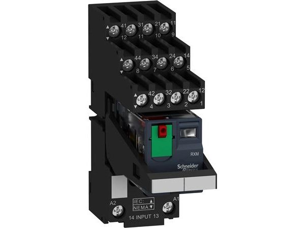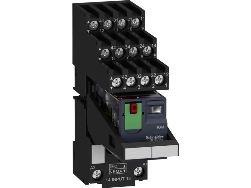 Schneider Electric Zelio RXM insticksrelä med testknapp och LED i sockel med separata terminaler, 4 C/O-kontakter 6A, 230VAC