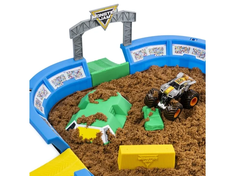 Den fantastiska Monster Dirt Arena från Monster Jam hjälper till att ge den fulla upplevelsen av häpnadsväckande monsterbilsakrobatik. Dirt Arena levereras med 1 officiell Monster Jam-monstertruck, ramper, hinder, formar för modellering och nästan 1 kg Monster Dirt-sand.