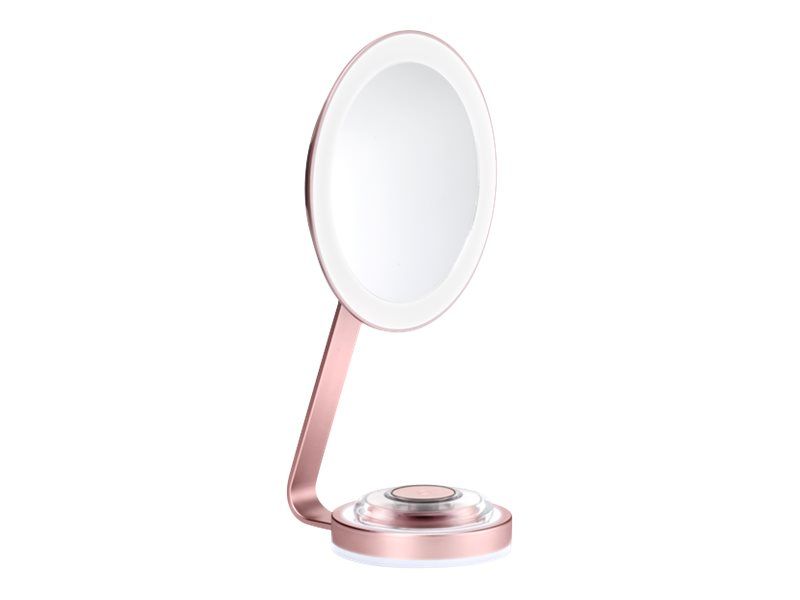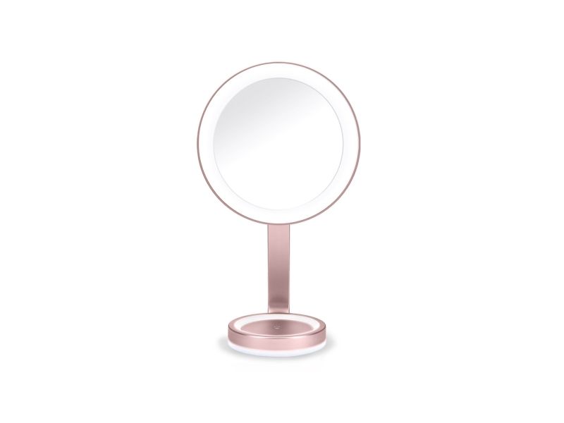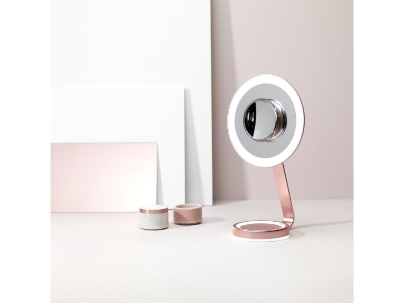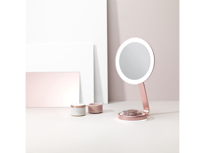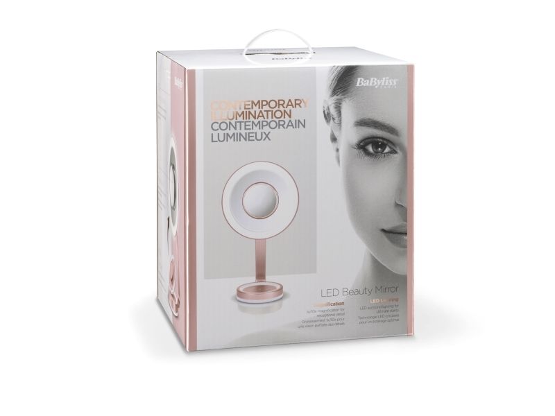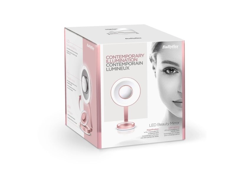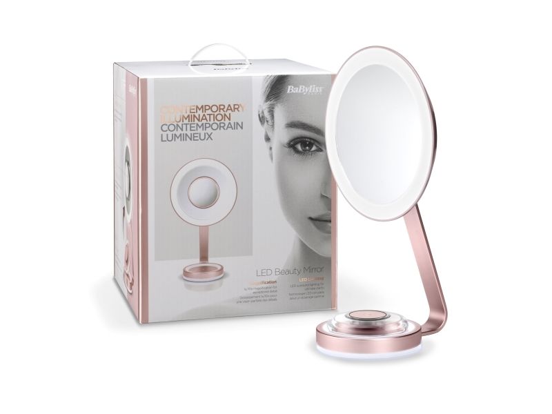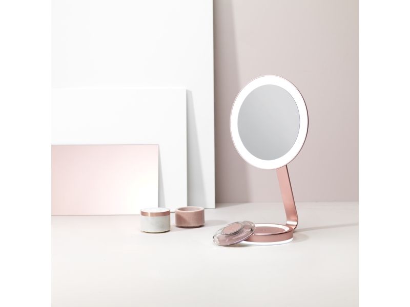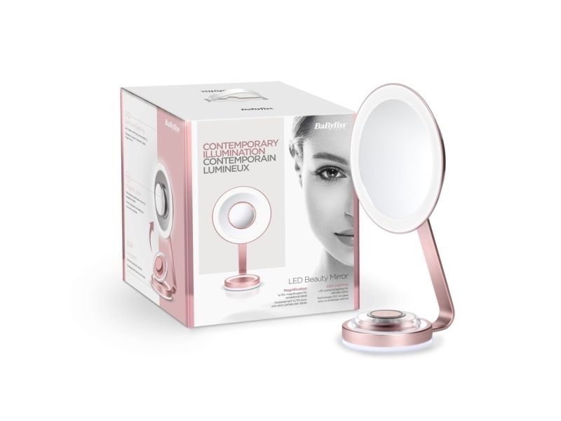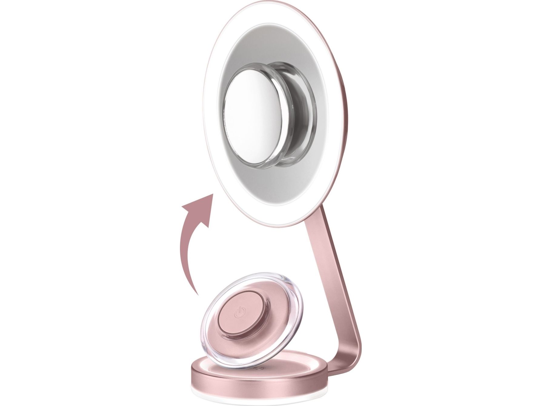 Trendig make-up spegel med satin ytbehandling och LED-belysning. Avtagbar kompakt spegel med 10X förstoring som fästs magnetiskt vid spegelns yta och placeras på basen när den inte används. 1,8 m sladd.