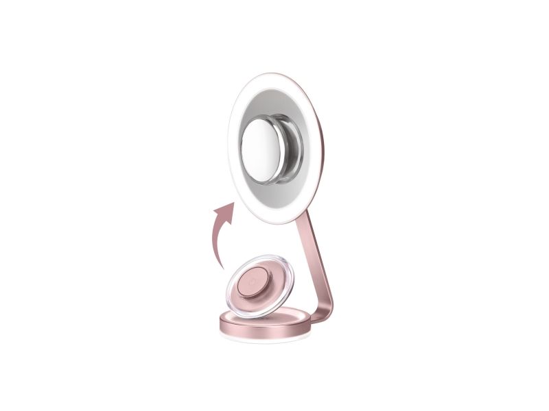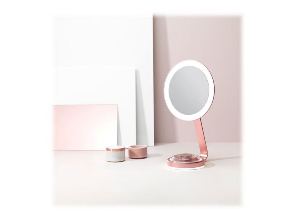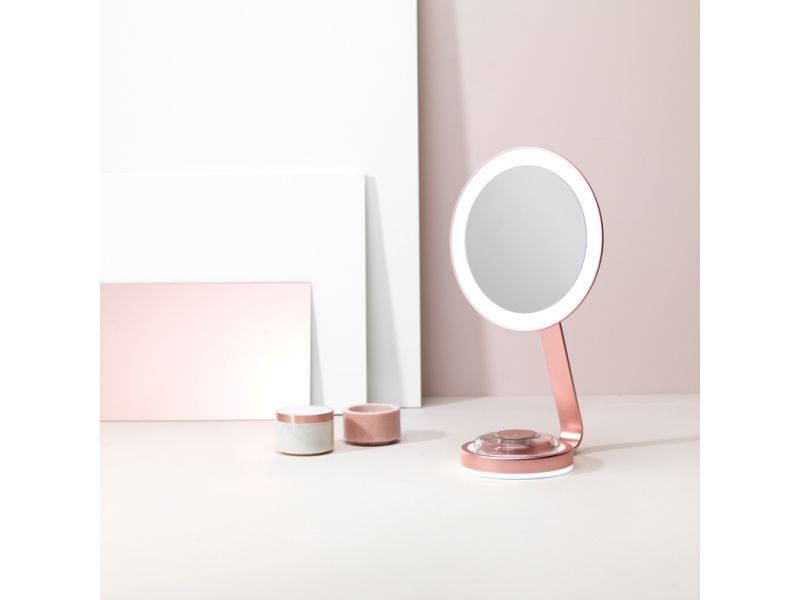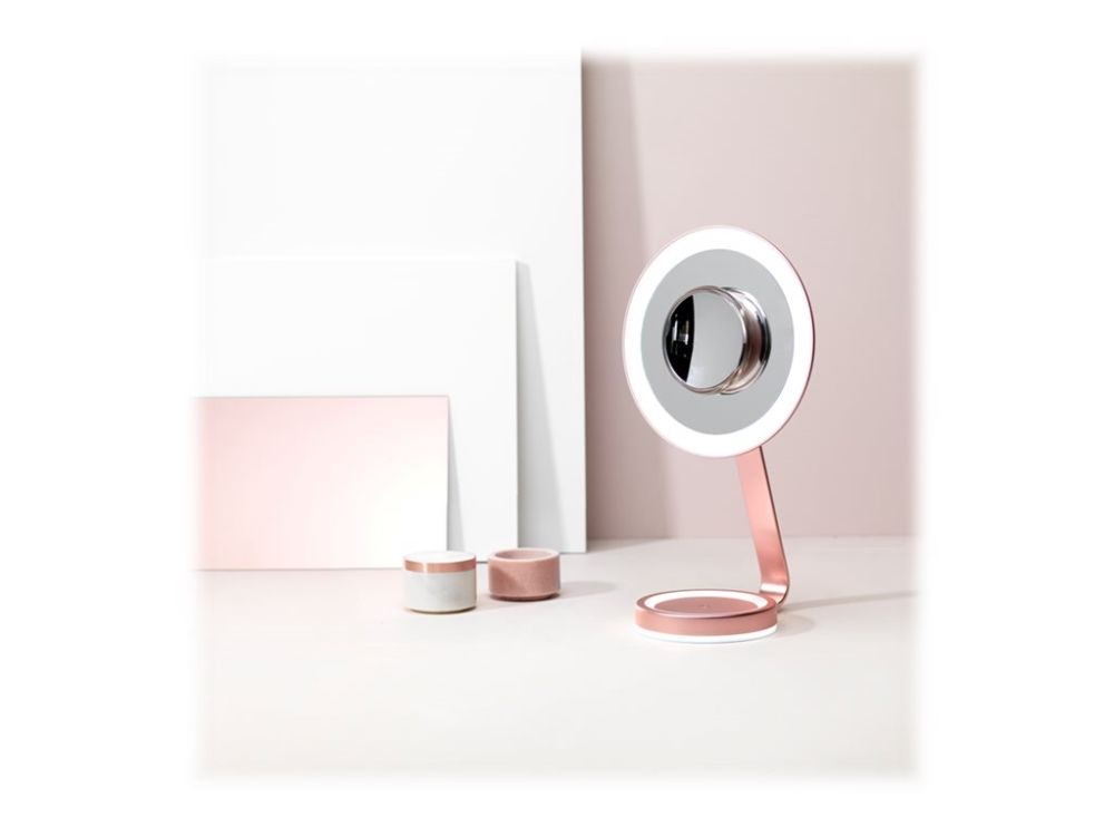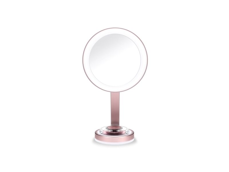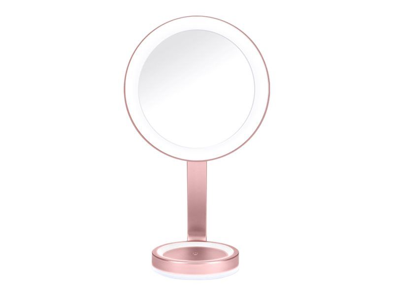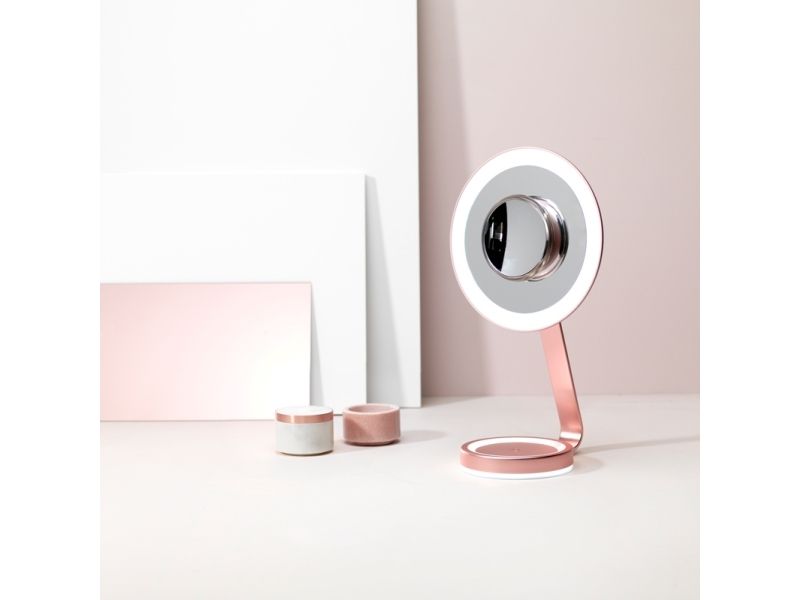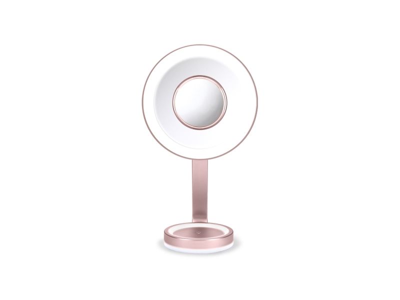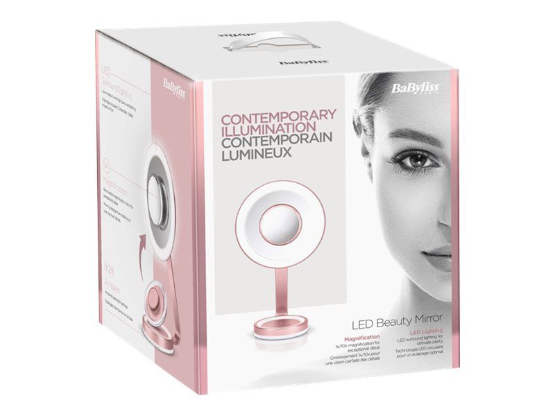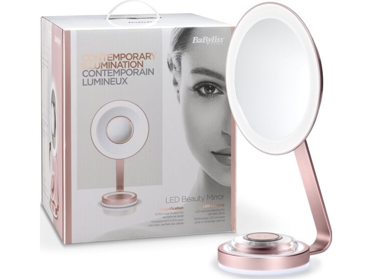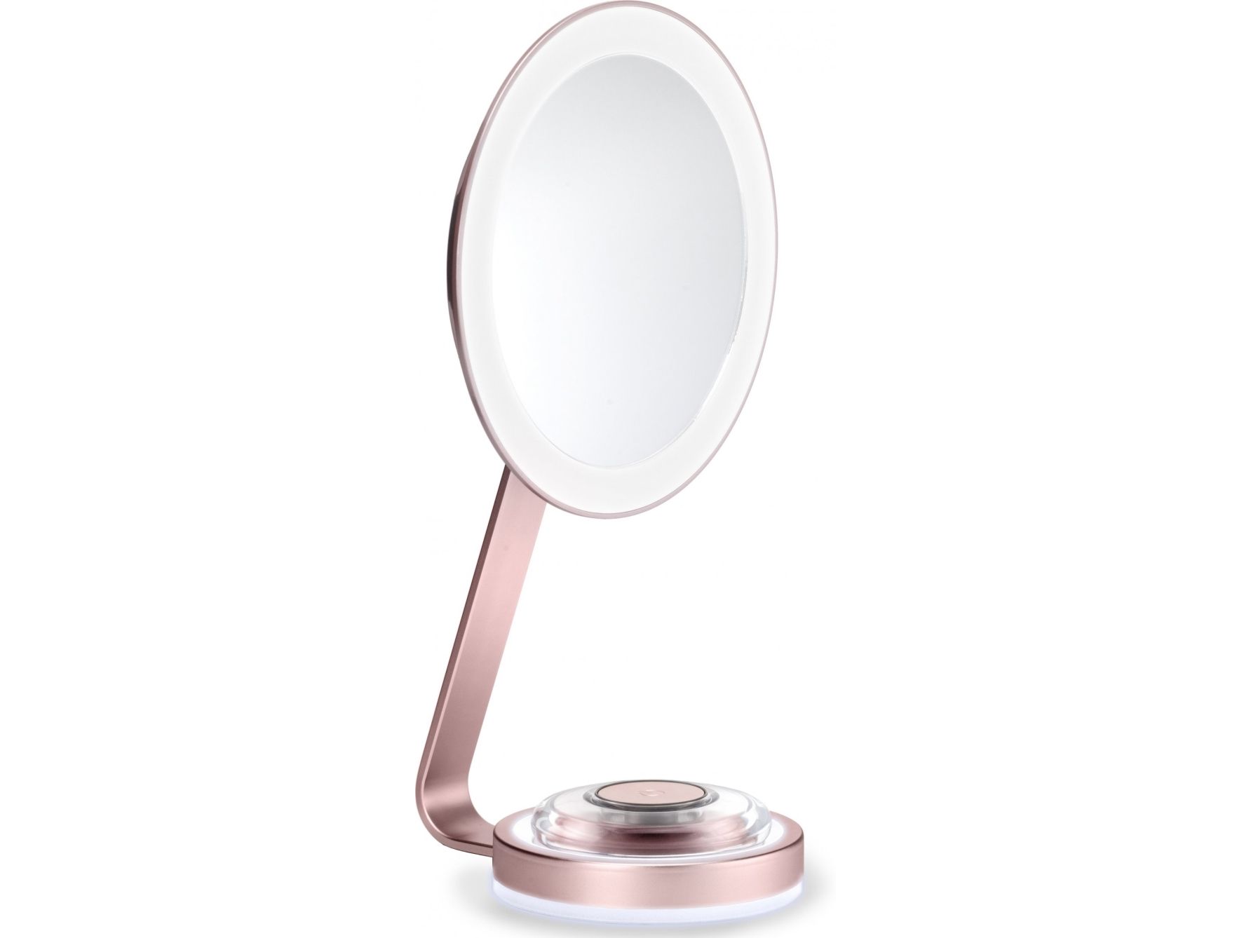 Trendig make-up spegel med satin ytbehandling och LED-belysning. Avtagbar kompakt spegel med 10X förstoring som fästs magnetiskt vid spegelns yta och placeras på basen när den inte används. 1,8 m sladd.