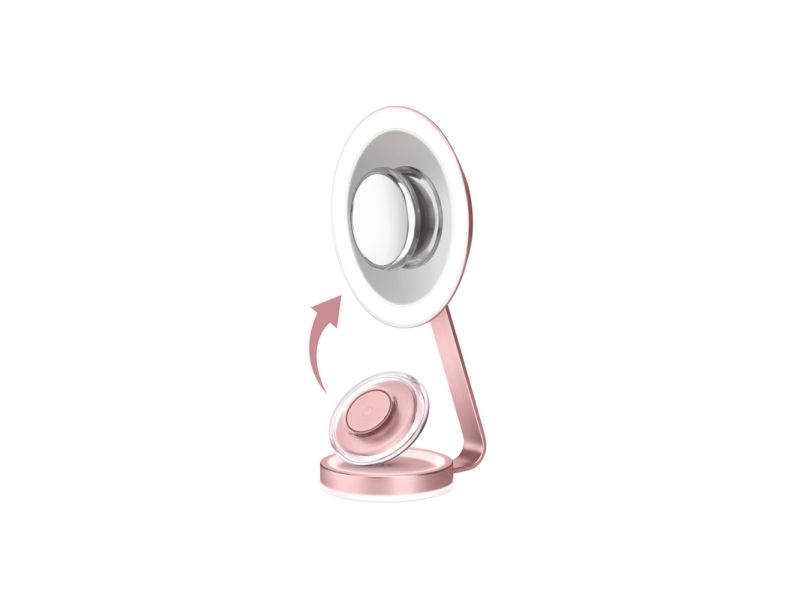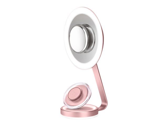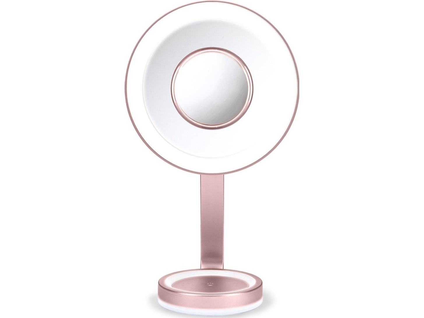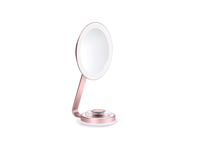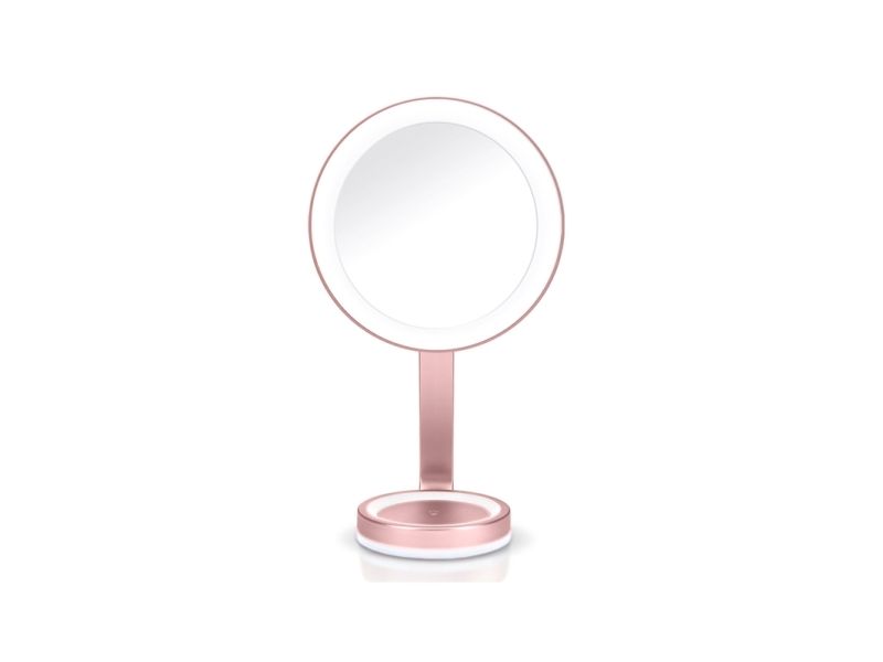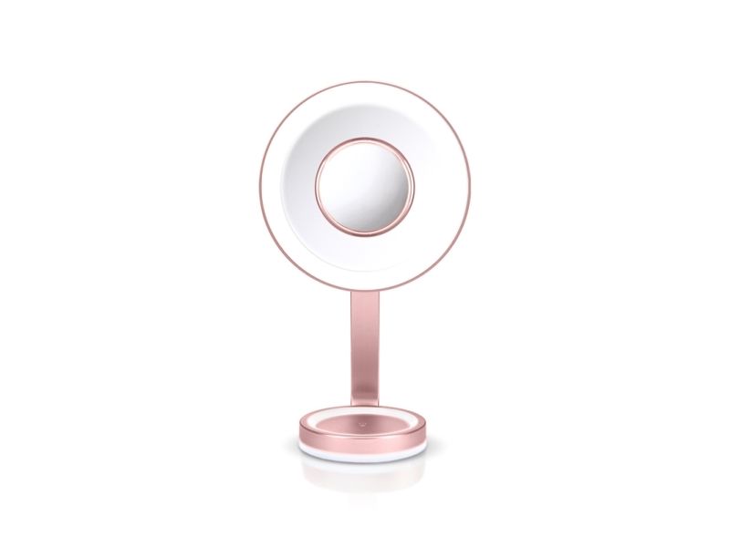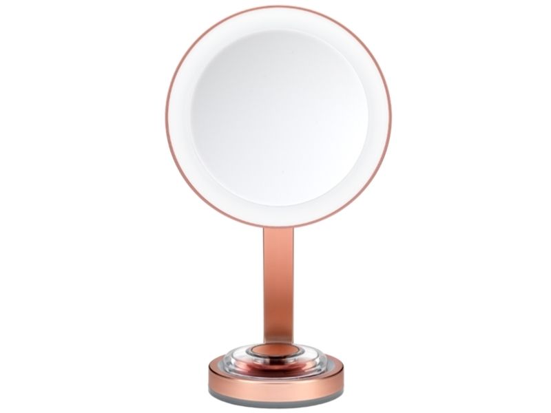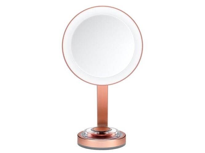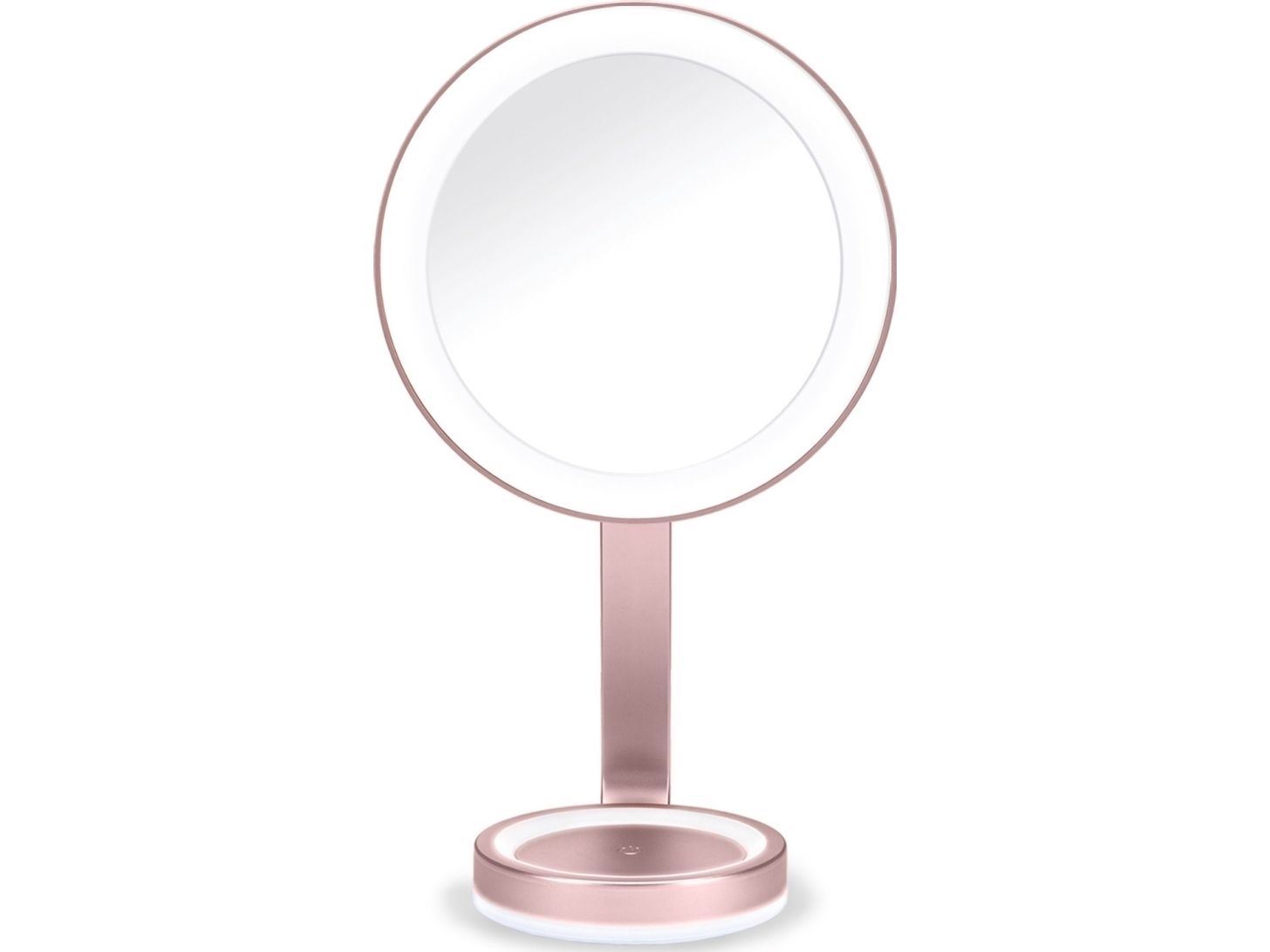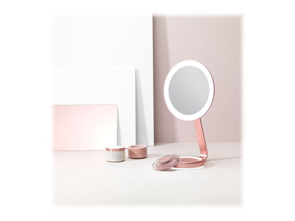 Trendig make-up spegel med satin ytbehandling och LED-belysning. Avtagbar kompakt spegel med 10X förstoring som fästs magnetiskt vid spegelns yta och placeras på basen när den inte används. 1,8 m sladd.