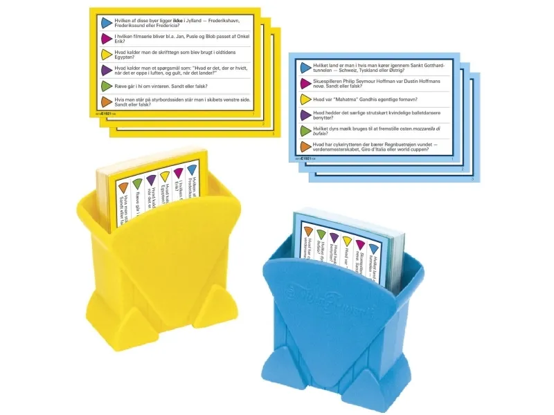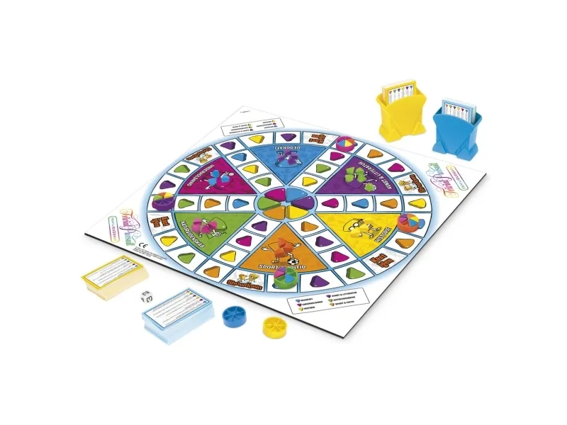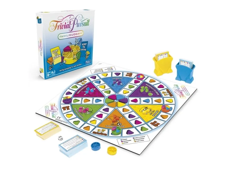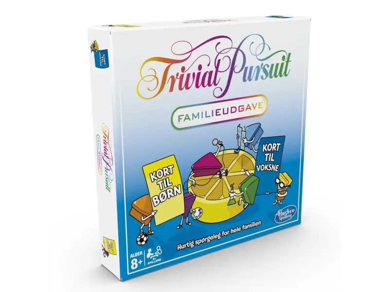 Det här är ett frågespel för familjen, från 8 år och uppåt! Det här snabbspelade frågespelet för familjen innehåller 400 kort med 2 400 frågor i 2 separata kortlekar: en för barnen och en för de vuxna. Familjeutgåvan av Trivial Pursuit-spelet innehåller en del nya frågor och går snabbt att spela, bland annat tack vare Showdown-utmaningen där 2 spelare tävlar om en tårtbit samtidigt. Spela individuellt eller i lag och turas om att flytta runt på brädan och svara rätt på frågorna för att vinna tårtbitarna. Familjemedlemmarna kan testa sina kunskaper genom att svara på frågor i 6 kategorier: Geografi, Underhållning, Historia, Sport och fritid, Konst och litteratur samt Natur och vetenskap. Bli den första spelaren i laget att vinna tårtbitar för alla 6 kategorier och svara på en sista fråga för att vinna hela spelet. Trivial Pursuit, tillhörande logotyp och den utmärkande designen på spelplanen, frågekorten, spelpjäserna och tårtbitarna är varumärken som tillhör Hasbro. Hasbro Gaming och alla relaterade termer är varumärken som tillhör Hasbro.