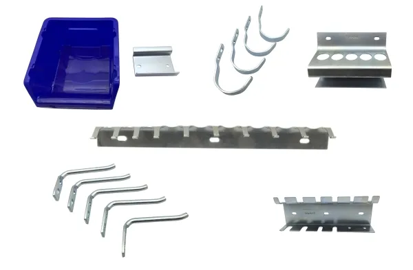 Det är inte alltid lätt att hålla reda på dina verktyg, så vi har sammanställt ett startkit med 17 delar för verktygstavlor för verkstäder. Verktygstavlan är utrustad med hål som är utformade för att rymma krokar, genomföringar och andra typer av hållare eller brickor. Detta är dock något som är mycket efterfrågat om du har mycket av det. Därför bör det inte råda någon tvekan om att en verktygstavla är ett extremt praktiskt verktyg att ha i din verkstad Innehåller följande: 2 svarta metalltavlor 1 skruvmejselhållare 1 hållare för tång 1 hållare för gaffelnyckel 2 blå förvaringslådor 4 runda krokar 6 raka krokar Tavlorna mäter 400×400 mm vardera Material: Metall Färg: svart