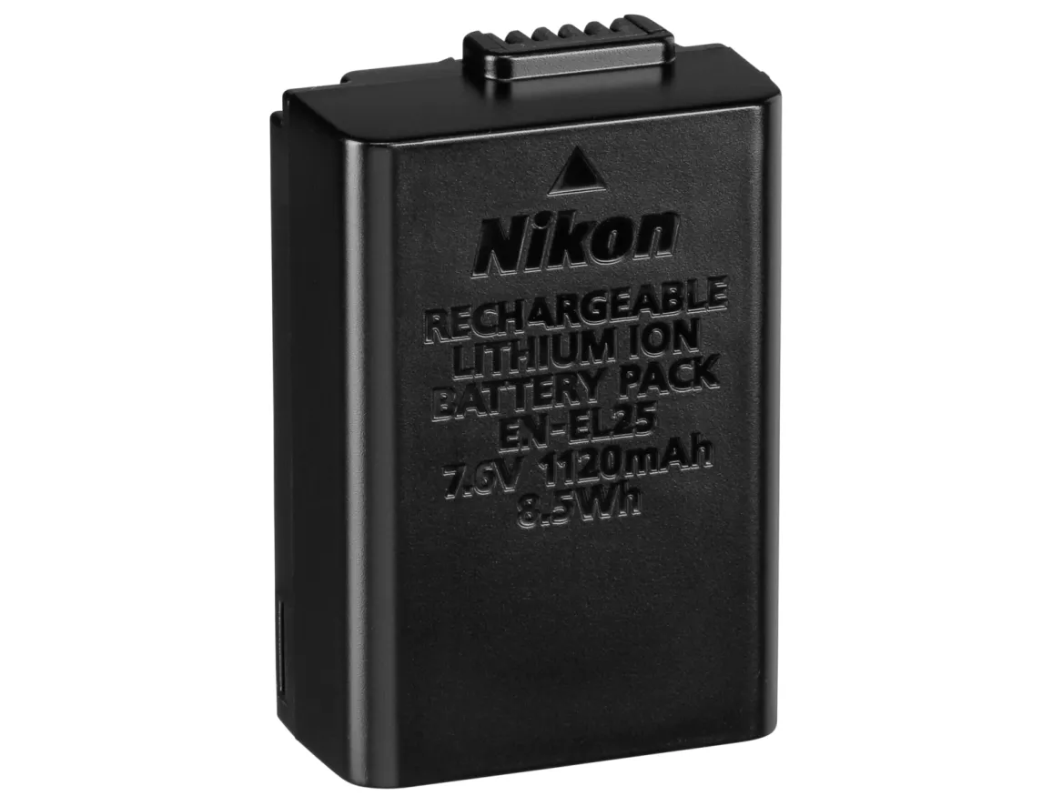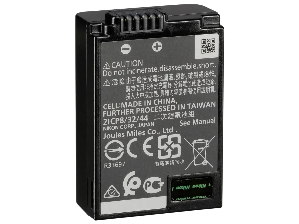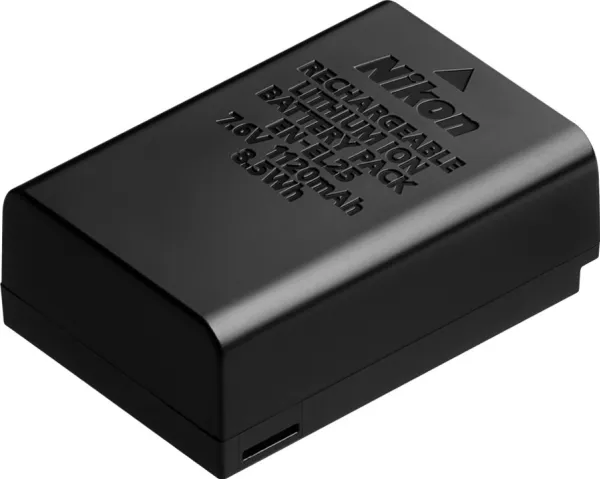 Compact rechargeable lithium-ion battery with high capacity for long operating life. This battery is compatible with specific Nikon cameras.