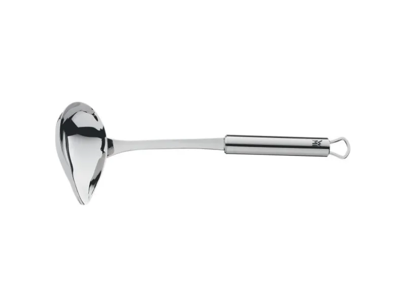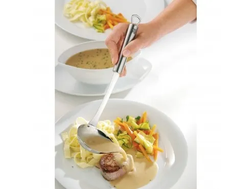 The pouring ladle is ideal for soups and sauces. The spout of the pouring ladle is shaped in such a way that you can pour accurate amounts without spilling a drop.\n\nThe benefits:\n- The perfect tool whatever you want to do.\n- Specialists for tricky tasks too.\n- Standardised design.\n- Made of Cromargan: stainless steel 18/10.\n- Precise workmanship, water-tight.\n- Suitable for the dishwasher.