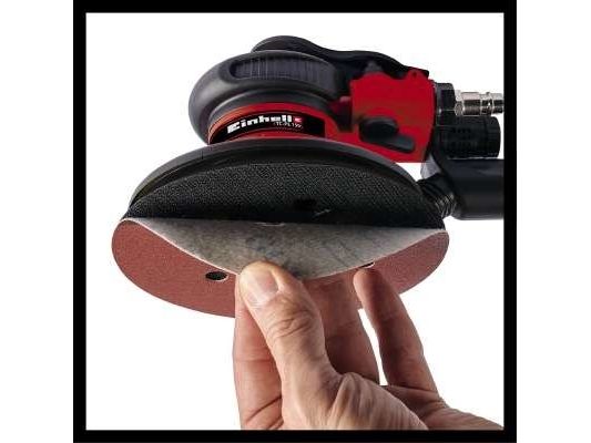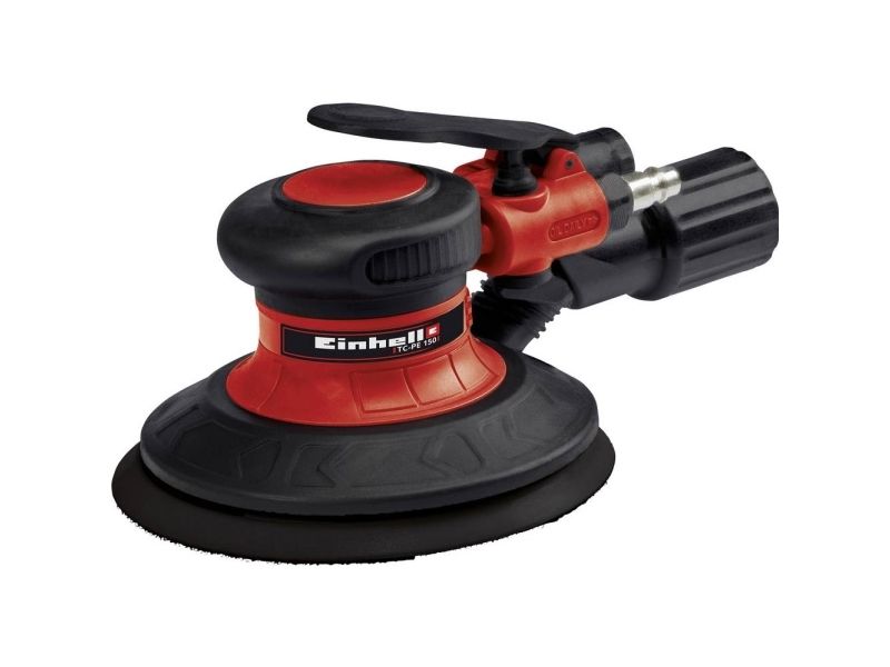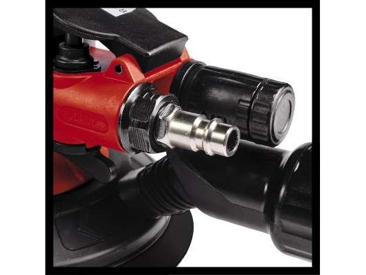 The Einhell TC-PE 150 pneumatic rotating grinder/sander makes light work of many different jobs such as grinding/sanding, smoothing, engraving or eliminating areas of unevenness. It is therefore a popular helper for jobs in the home, workshed and garden. The compact eccentric grinder/sander has a grinding/sanding disc diameter of 150 millimeters. It is suitable for grinding/sanding work on wood, iron and plastic. An infinitely adjusting lever allows the ideal speed to be set every time. For comfortable operation it has a vibration-absorbing handle. Sheets of abrasive papers can be changed quickly on the grinding/sanding disc thanks to its hook-and-loop fastener. Top performance is offered by the rotating grinder/sander using a hose with an inner diameter of 9 millimeters or over. To keep the work area clean there is an extractor adapter for connecting a vacuum cleaner or vacuum extraction system. For getting started straight away the product is supplied complete with 6 sheets of abrasive papers (2x grit size 80/100/120 each), one nipple and one wrench.