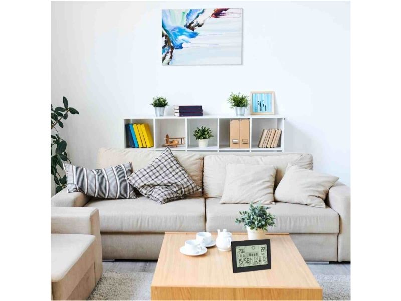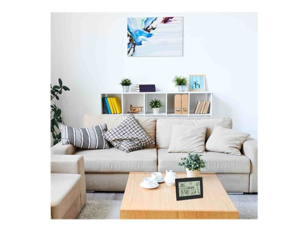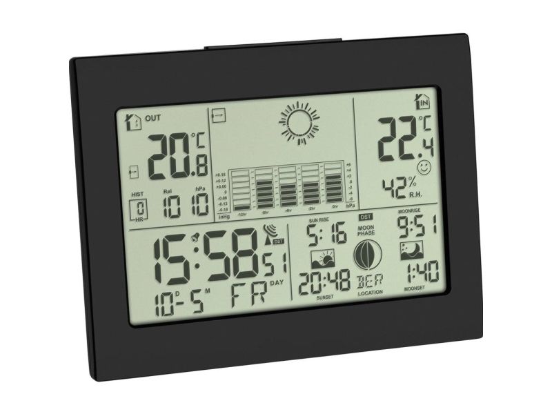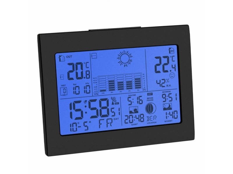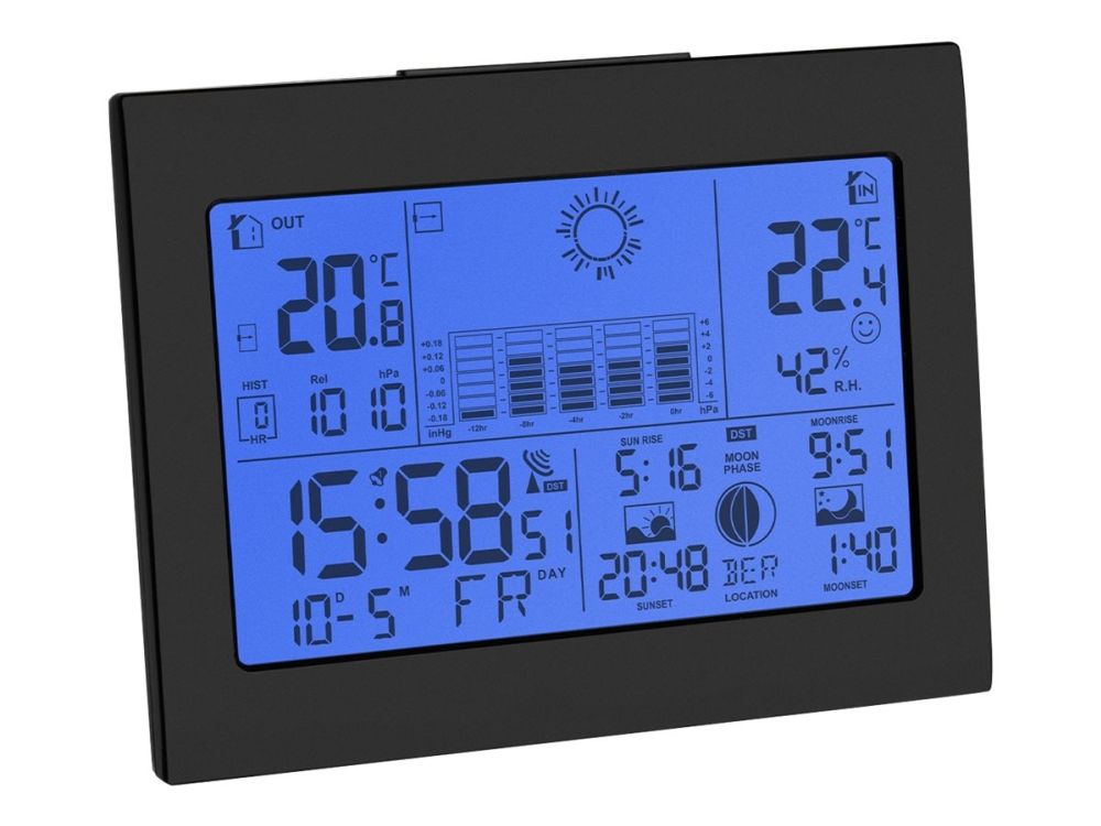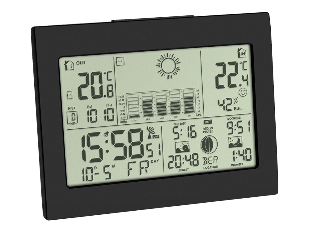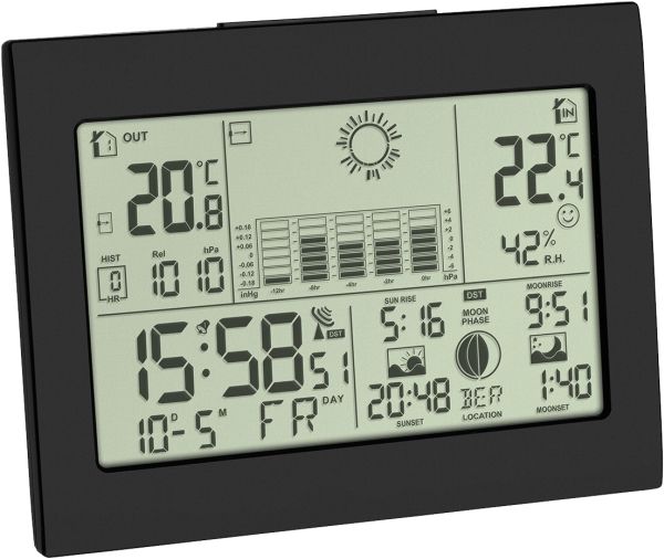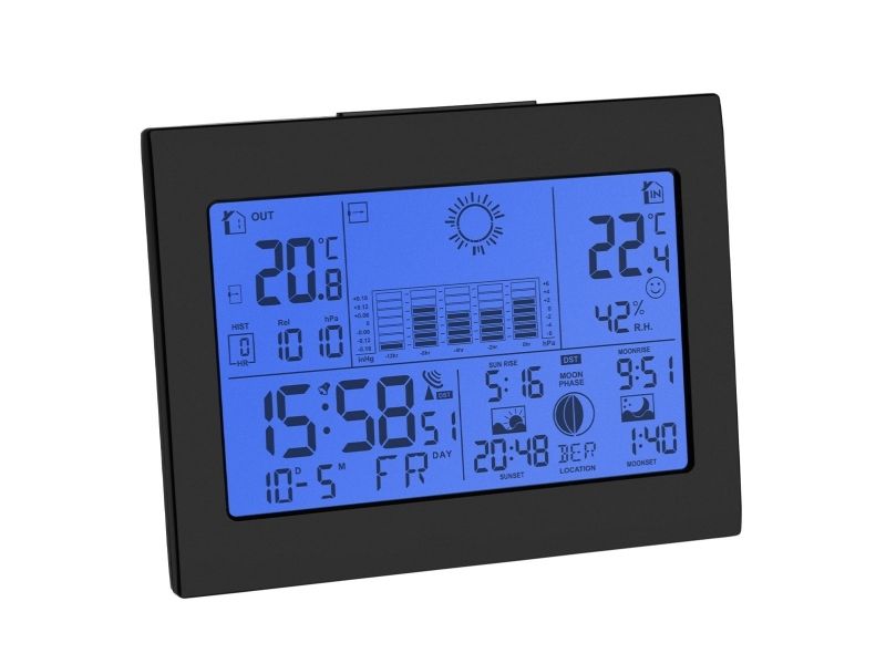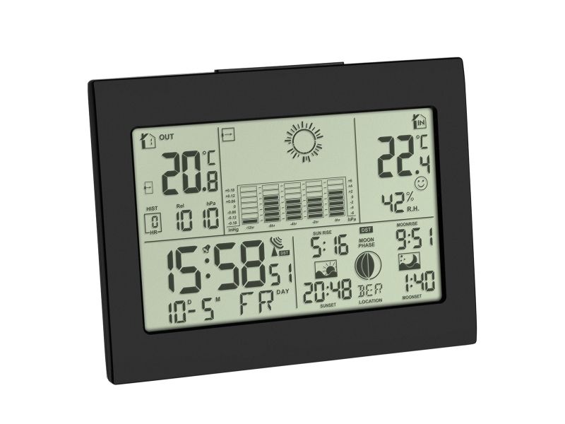 Just a quick look at the radio-controlled weather station HORIZON and you're immediately informed on your current living climate and the local weather. Sun, clouds or raindrops, an integrated electronic barometer measures the air pressure and based on the changes, the weather symbol gives a forecast of the coming weather. The bar chart on the display shows you the air pressure history of the last 12 hours and can therefore get a more accurate picture of the weather development. The outside temperature is determined by a radio transmitter. As an option, two further radio transmitters can be connected to the HORIZON radio-controlled weather station, e.g. to monitor the basement. The time and date are updated via the DCF77 signal sent by the atomic clock. The device also features all the functions of an alarm clock. Two wake-up alarms with snooze function ensure that you get up on time. The blue backlight can be switched on at the push of a button. In addition, the station shows the current moon phase and the time for the sun and moon to rise and set.