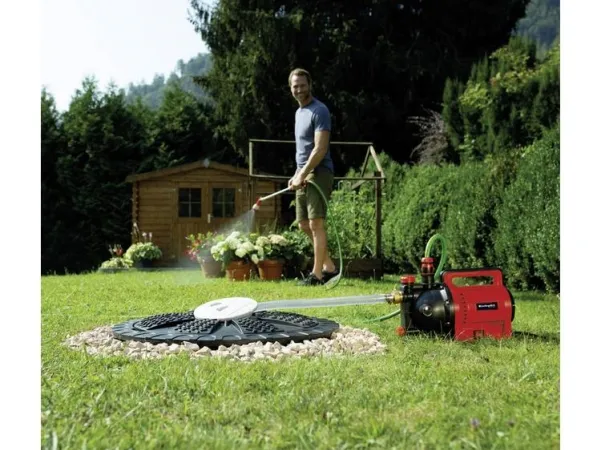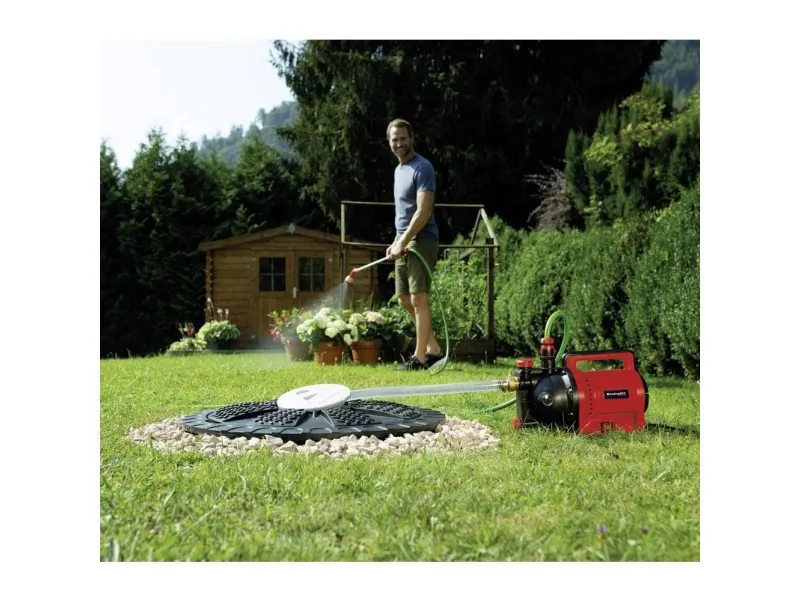 The Einhell GC-GP 1045 garden pump is a valuable helper for garden care – economical and ecological! Only flowers that are well watered develop colorful blooms, and an abundant vegetable garden will not flourish without optimum watering. Ideally suitable here is “soft” rainwater or water from natural sources as the “most beneficial” irrigation water. Unlike water from the tap, rainwater is lime-free, free of germ-killing additives and costs nothing! With a powerful 1,050 W rating the garden pump delivers up to 4,500 l of clean water per hour. The practical handle makes it easy to transport to the cistern, rain barrel or well. There is an On/Off switch for activating the garden pump. Featuring a large water filler opening and a water filling indicator, the garden pump lets you see at a glance whether water has already been filled in the pump. Residual water can be completely emptied out through the water drain screw, so that the pump is protected from frost when stowed away. The thermo protection preserves the pump against overload damage during use. The garden pump also features high-quality mechanical sealings, a suction connection with 42 mm (1 1/4" male thread) and a pressure connector with 33.3mm (1" female thread).