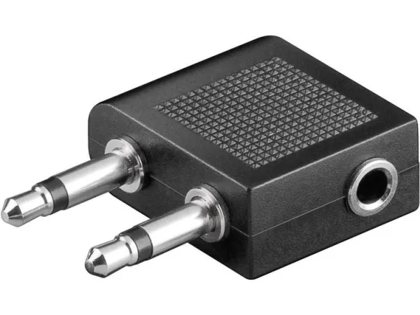 kompakta jackflygadapter gör det möjligt att använda dina egna hörlurar på planet. Den dubbla 3,5 mm jackpluggen ansluts helt enkelt till den dubbla monoanslutningen som de flesta flygplansstolar har inbyggda. Detta innebär att du nu kan ansluta alla hörlurar med en 3,5 mm jackplugg. Onödiga utgifter för speciella hörlurar hör nu till det förflutna.